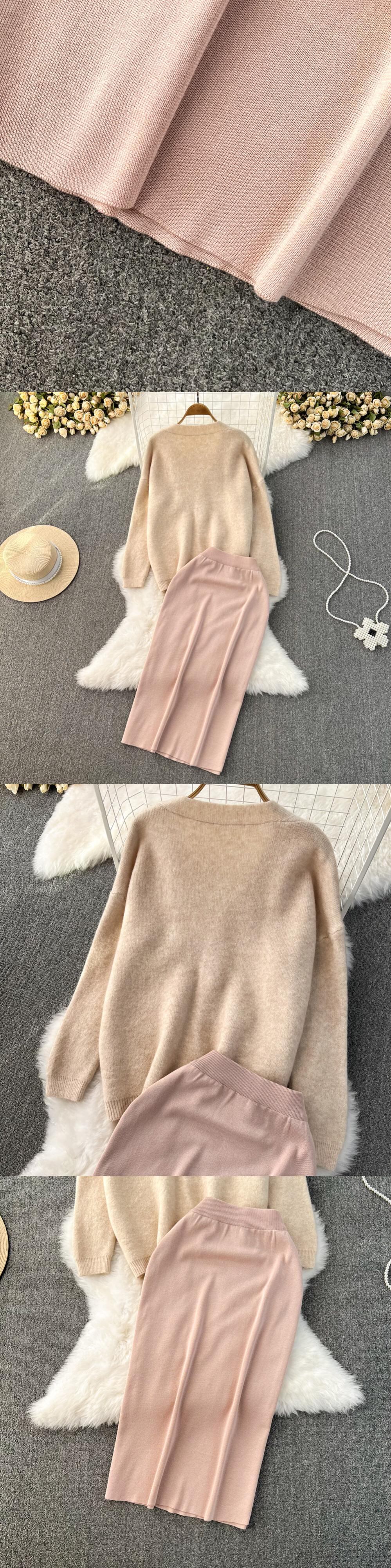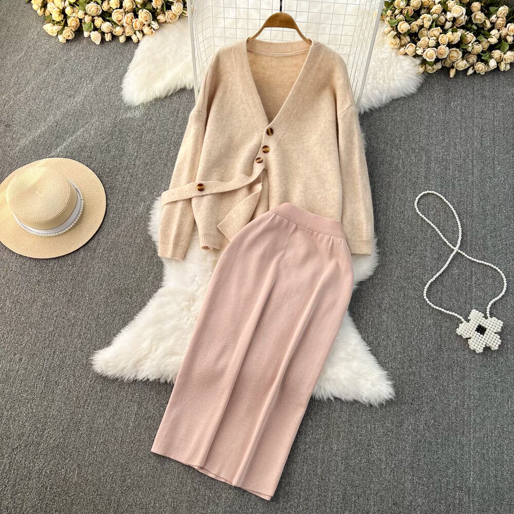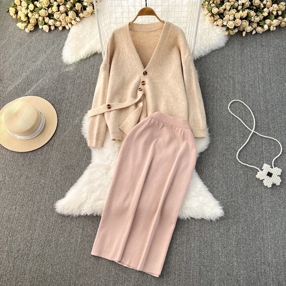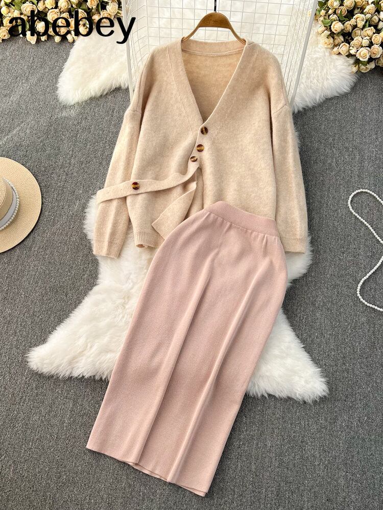 ツーピースセット女性スカート長袖カーディガントップス + ペンシルスカート 2 点セット女性女性セーター + ニットスカートセット冬のスーツ ロング ウィンター 冬物 Abe50224615533