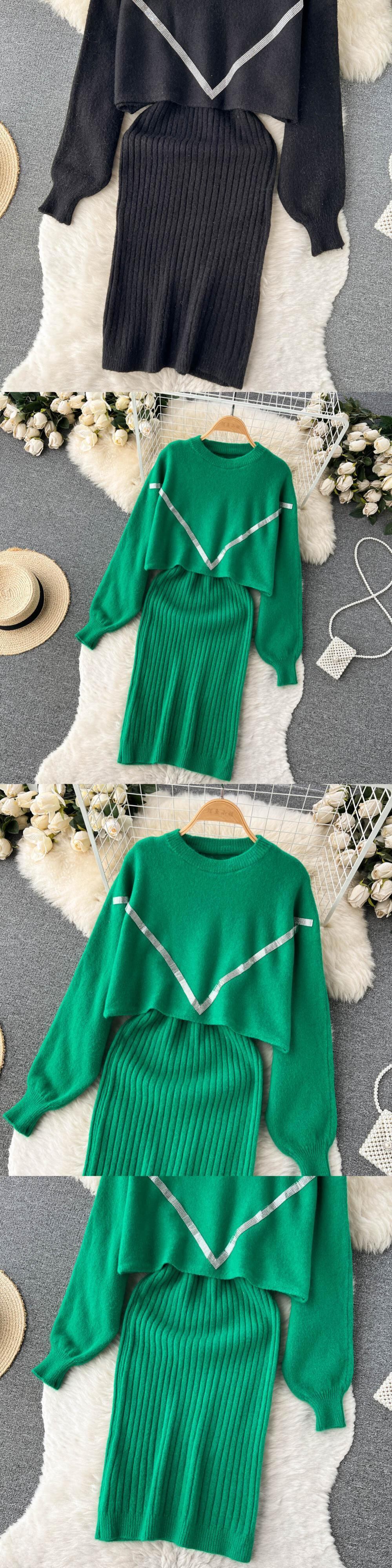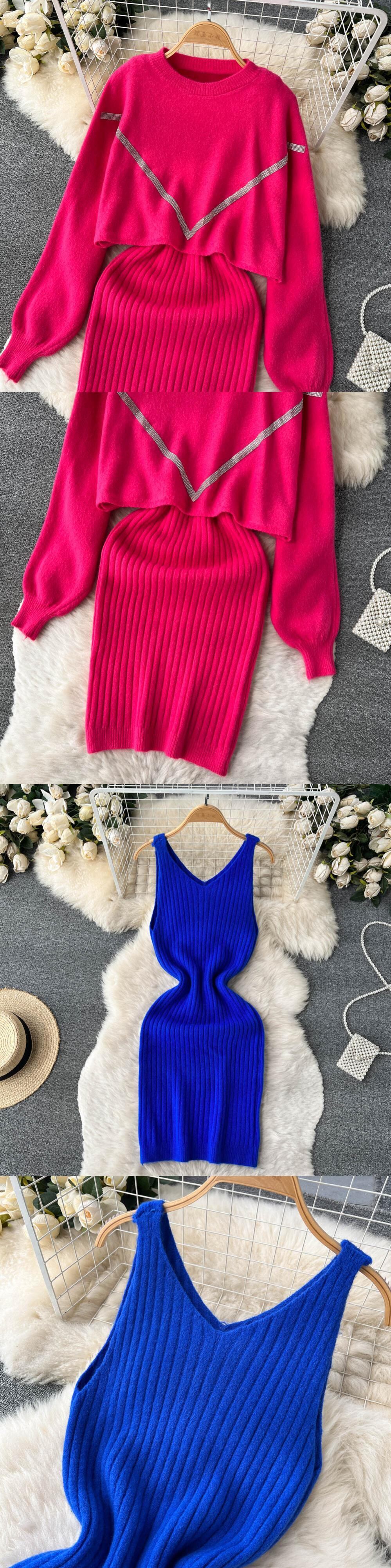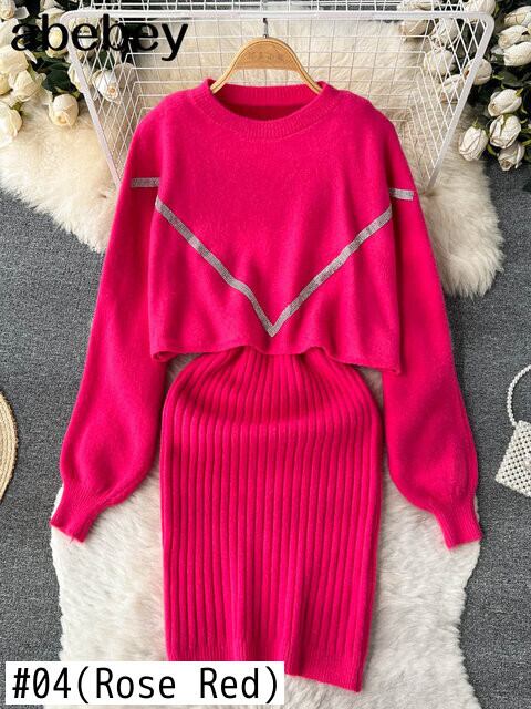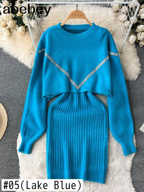 女性スリムツーピースセットセータードレス秋冬ウエストニットアンサンブルミディアムロングパーティードレス オータム 秋物 ウィンター 冬物 Abe61047858075