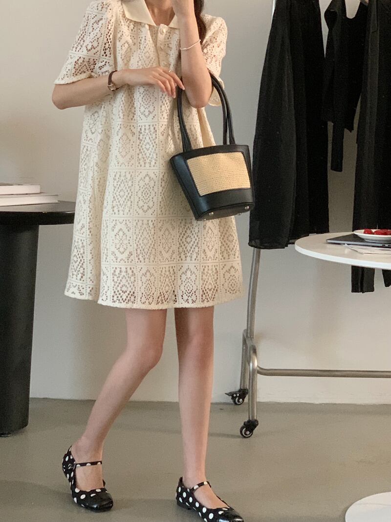 女性ドレスミニ女性レース中空無地ラペル半袖 2022 夏シャツドレス ショート ハーフスリーブ サマー 夏物 ソリッドカラー Rhc49533044120