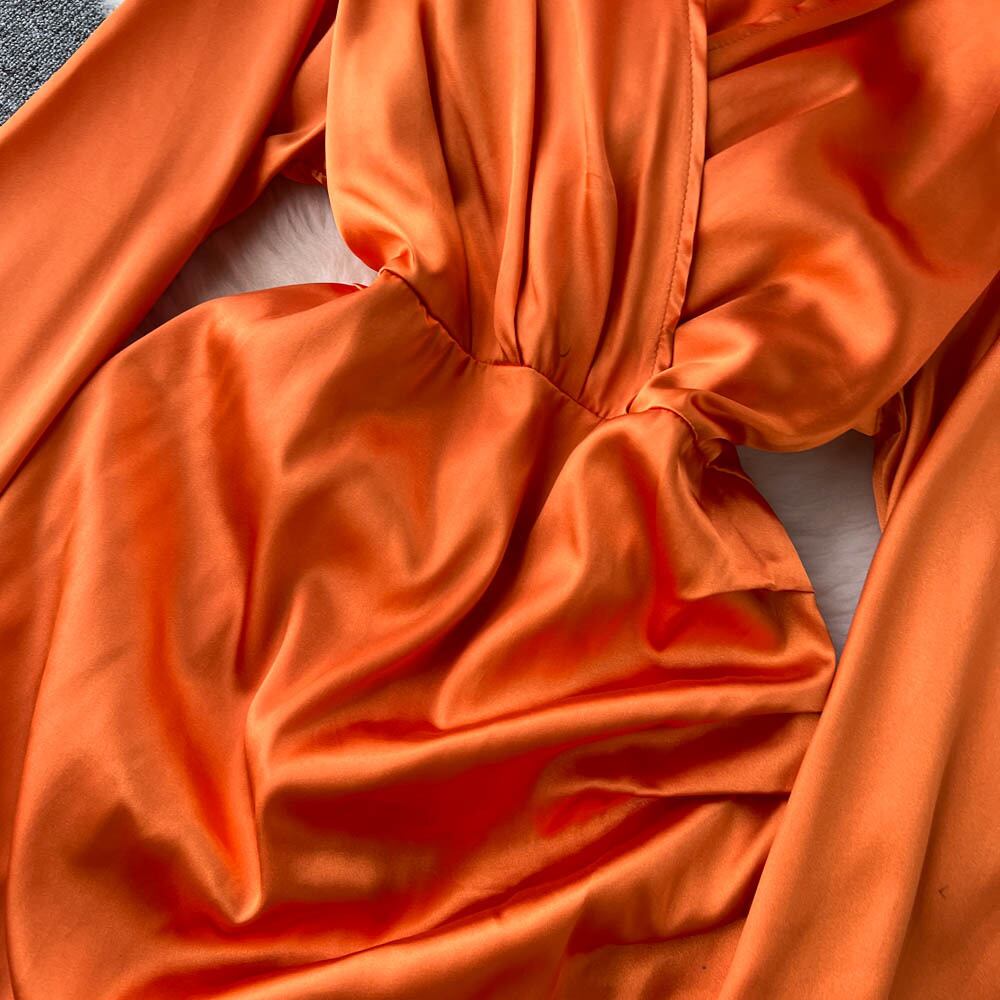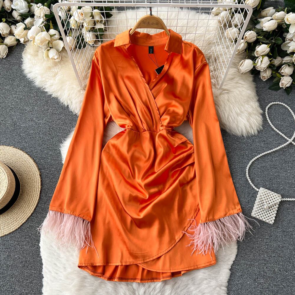 女性ローズレッドサテンフェザー装飾レースアップミニドレス春のシックなストリートプリーツ不規則な裾ドレス スプリング 春物 Abe10302275692