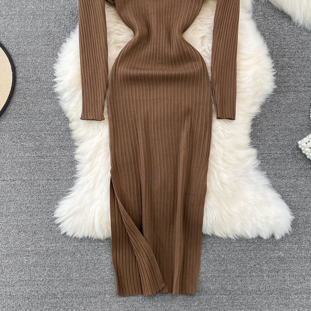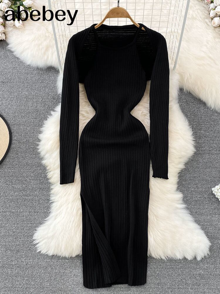 2022 固体ニット女性セットルーズ長袖カーディガンクロップトップ + 固体弾性ドレスフレンチスタイルのツーピースセット ロング エラスティック 伸縮 ソリッドカラー Abe72775530614