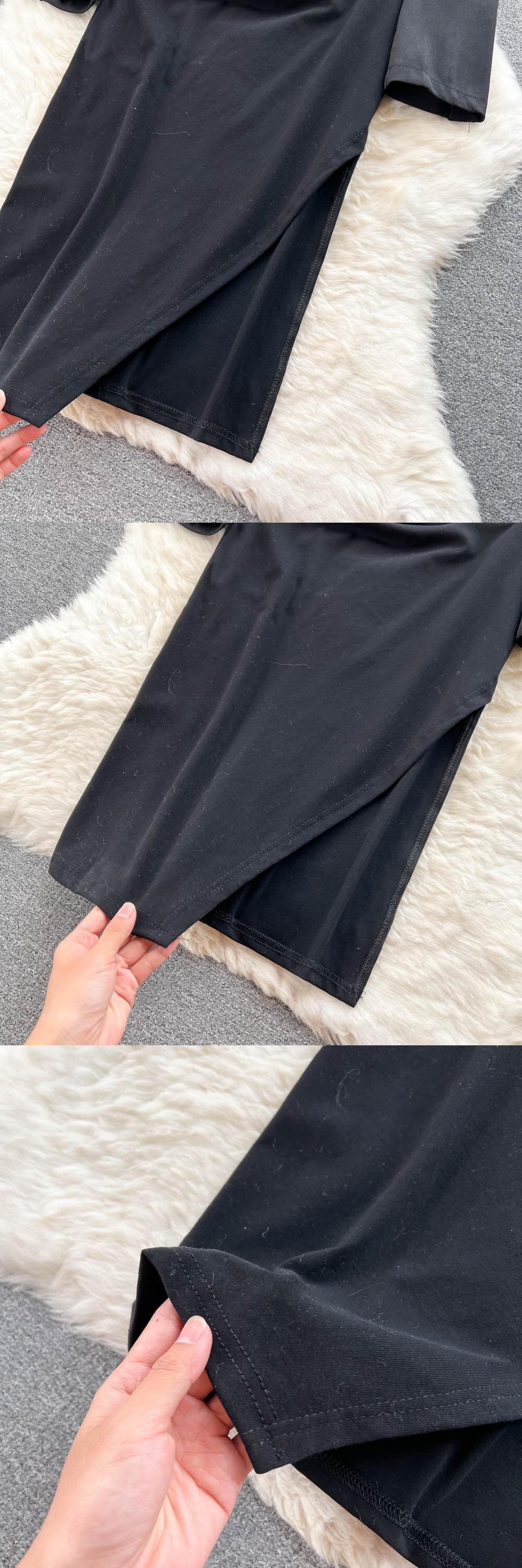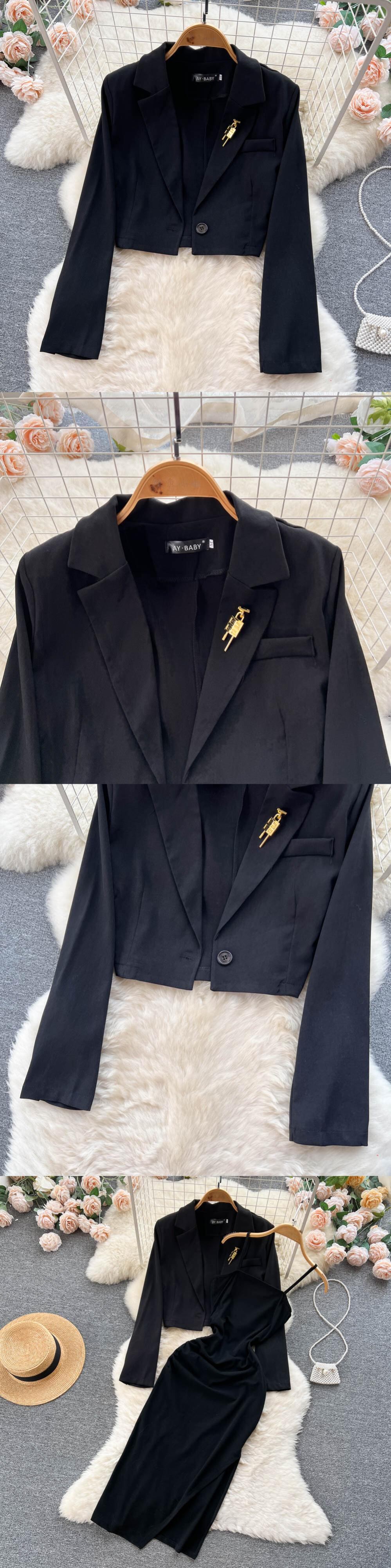 女性 2 点セット長袖黒コート トップ + ボディコン スリム ウエストシャーリング スパゲッティ ストラップ ドレス ロング ブラック Abe20028727343