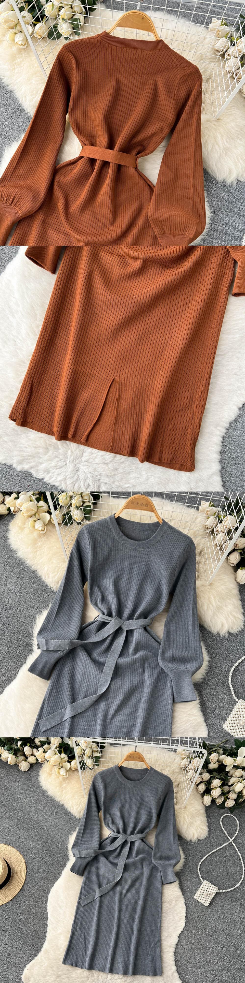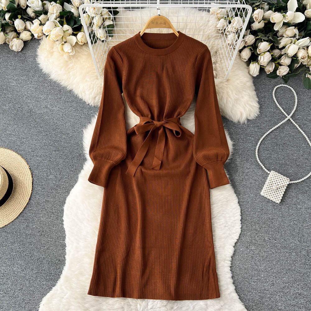 秋のフレンチソリッドニットドレス女性 o ネックセーターシース t ドレス弾性ウエスト OL 暖かいミディロングドレス エラスティック 伸縮 オータム 秋物 Oネック ソリッドカラー Abe50956238097