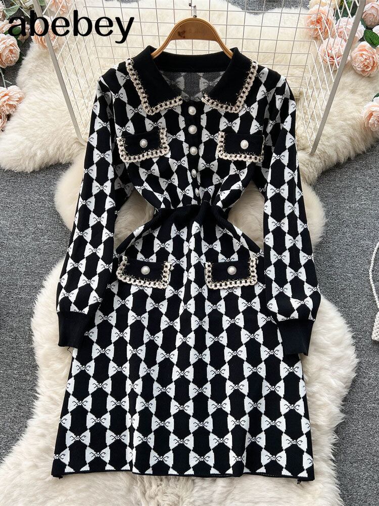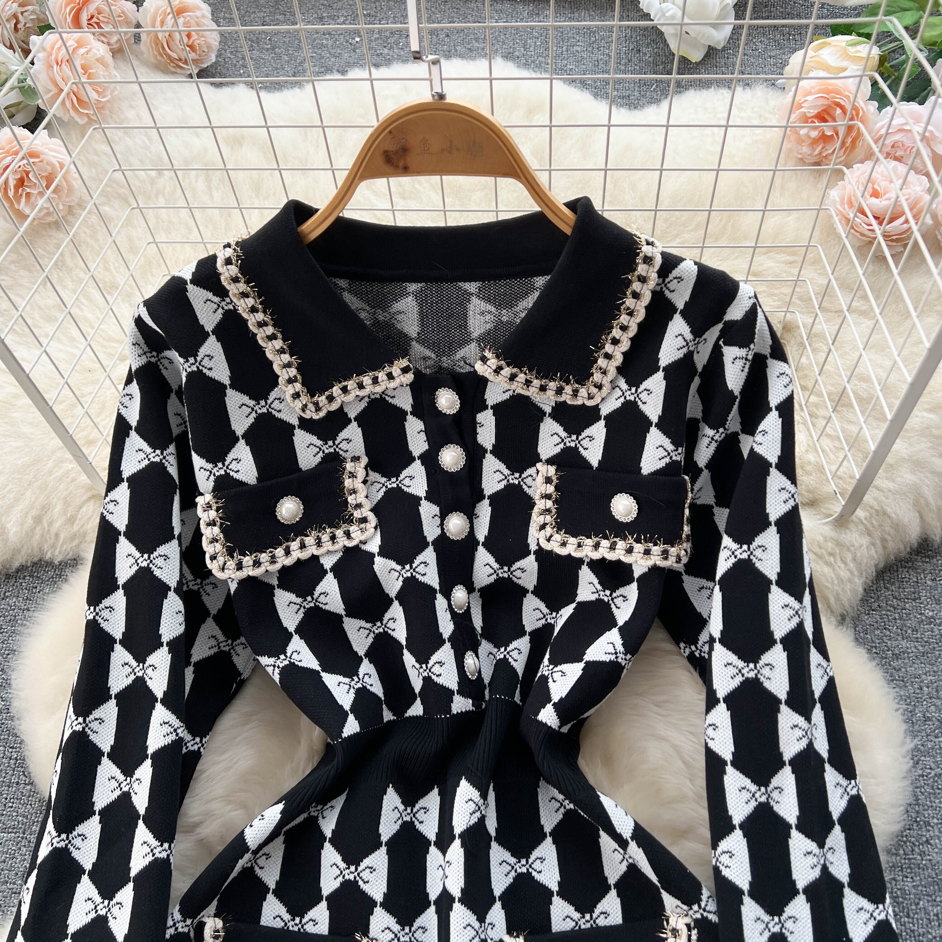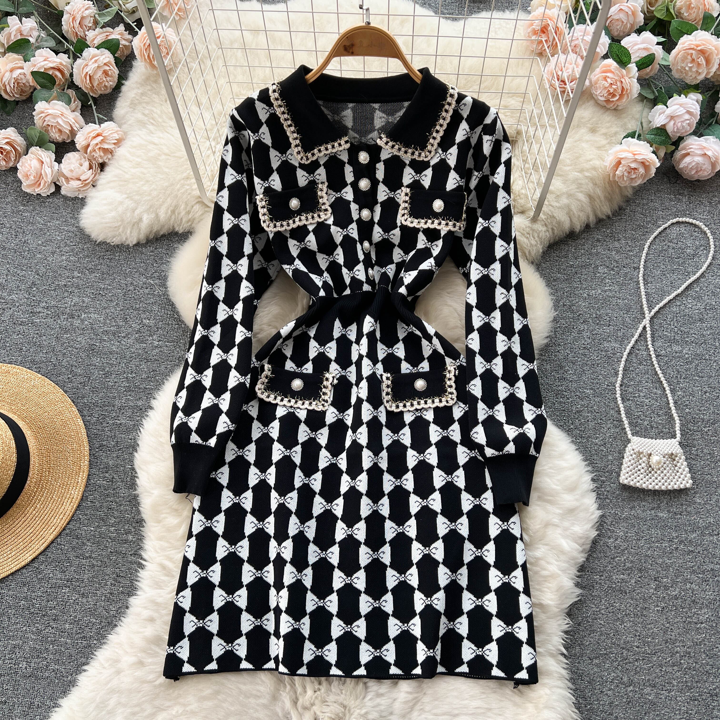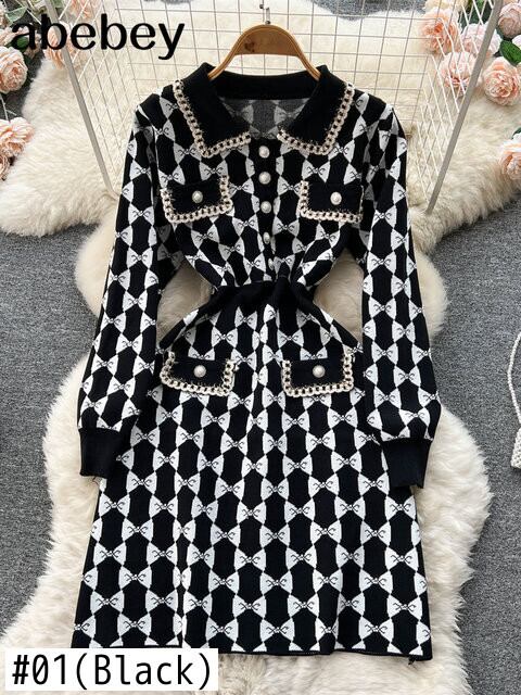 冬のシニアチェック柄ニットドレス対照的な色長袖ボタンスリムフレンチ女性シニア弾性暖かいセータードレス ロング エラスティック 伸縮 ウィンター 冬物 Abe55354985819
