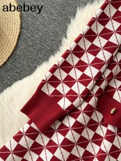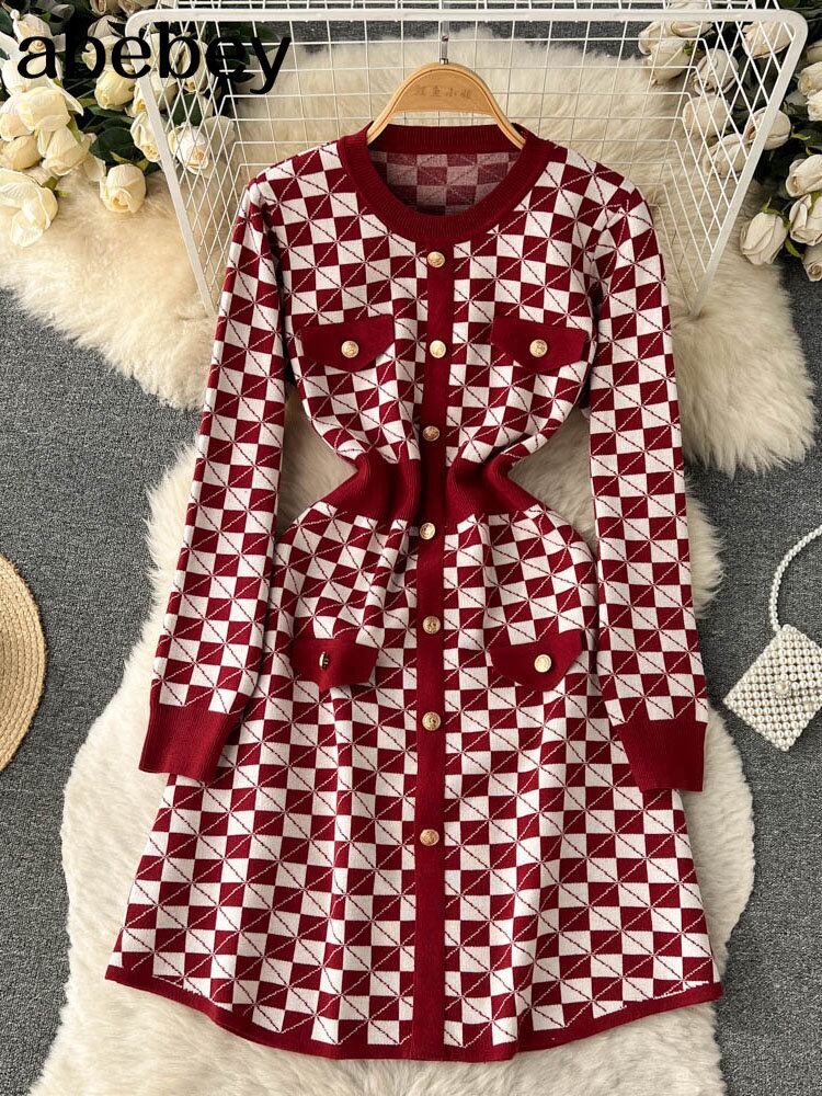 チェック柄長袖セータードレス女性 O ネックフレンチスタイル秋のニット暖かいドレス ロング オータム 秋物 Oネック Abe25035909880