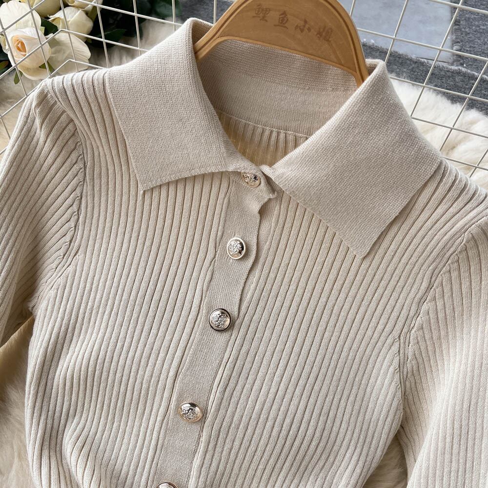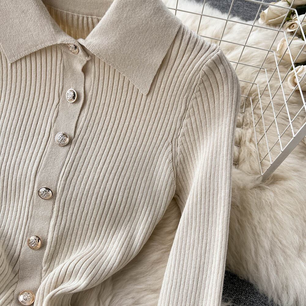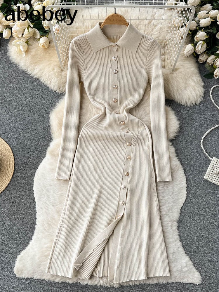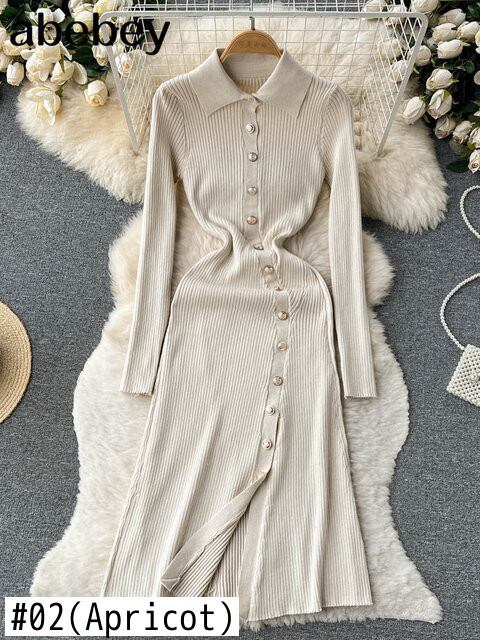 女性のセクシーなセータードレスターンダウンカラー長袖弾性ペンシルドレス秋ボタンボディコンストライプニットドレス ロング エラスティック 伸縮 オータム 秋物 Abe9670730729