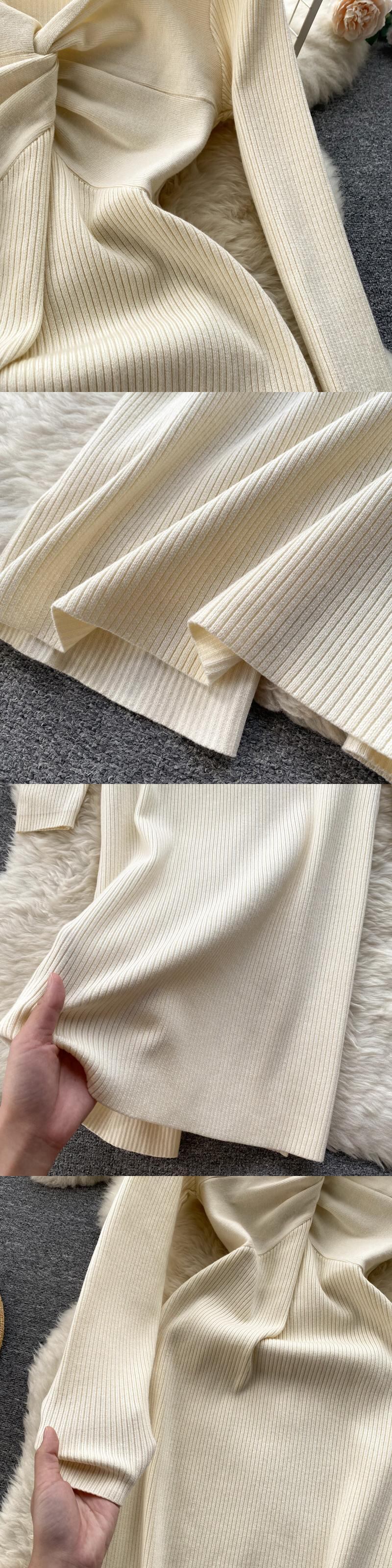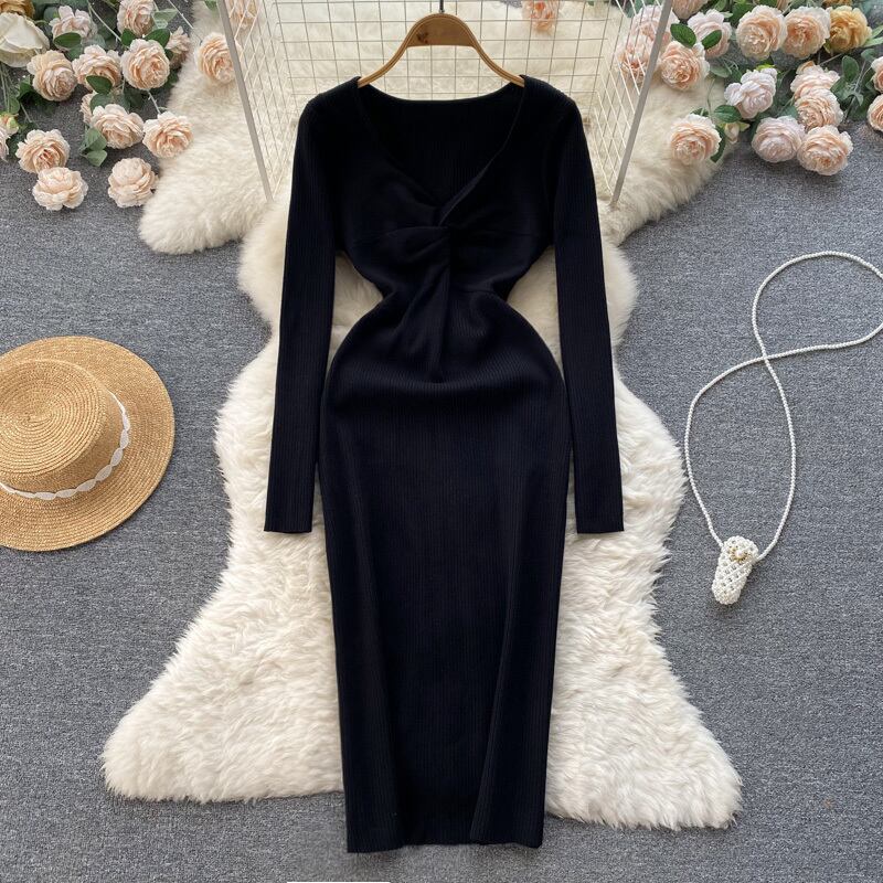 女性クロスニットペンシルドレス長袖 V ネック弾性スリムドレス秋冬セクシーなボディコン暖かいセータードレス ロング エラスティック 伸縮 オータム 秋物 ウィンター 冬物 Vネック Abe11160379105