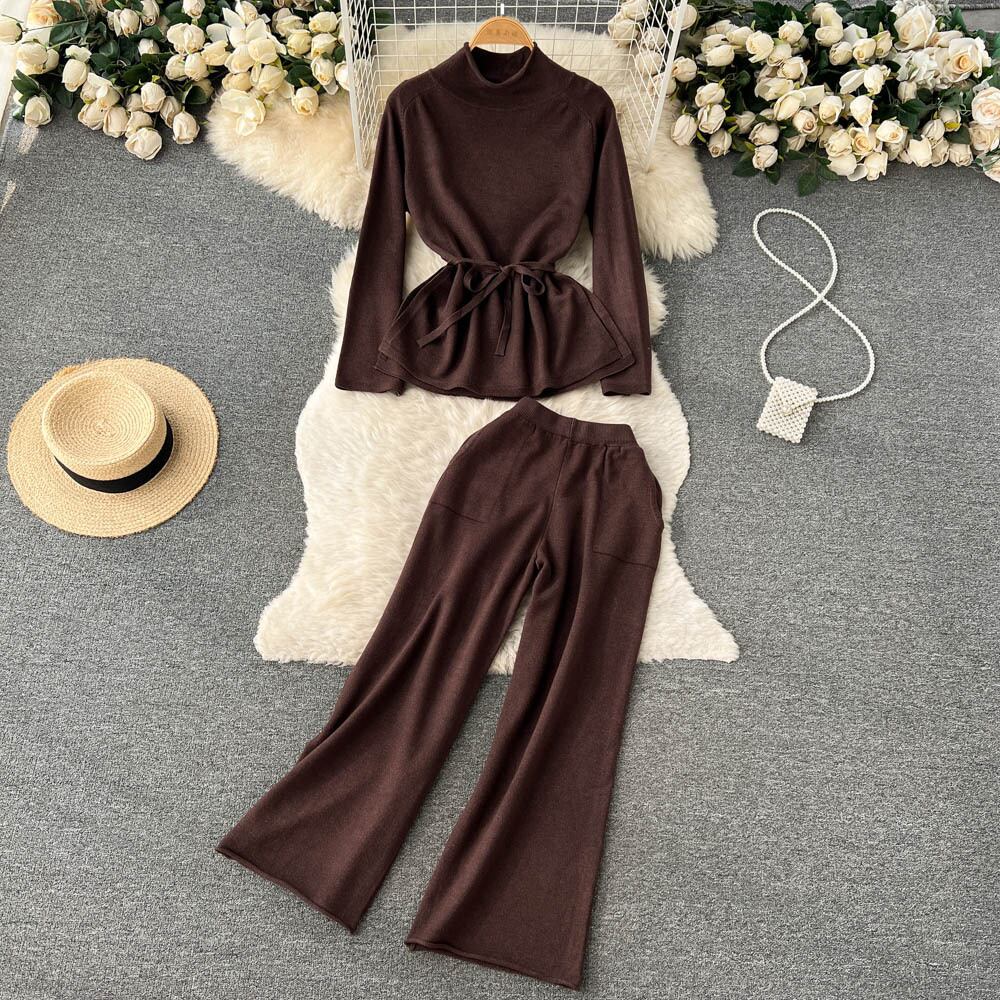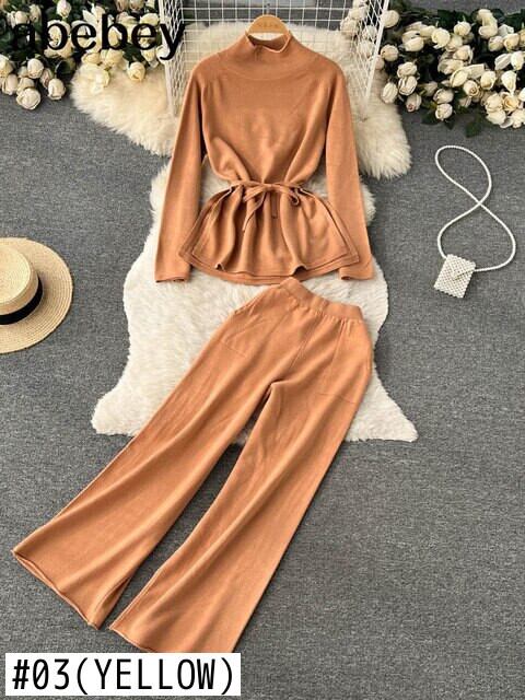 女性ハーフタートルネックプリーツプルオーバーとワイドレッグパンツニットセット冬暖かいセータースーツズボン衣装 ウィンター 冬物 ワイドパンツ Abe92997956591