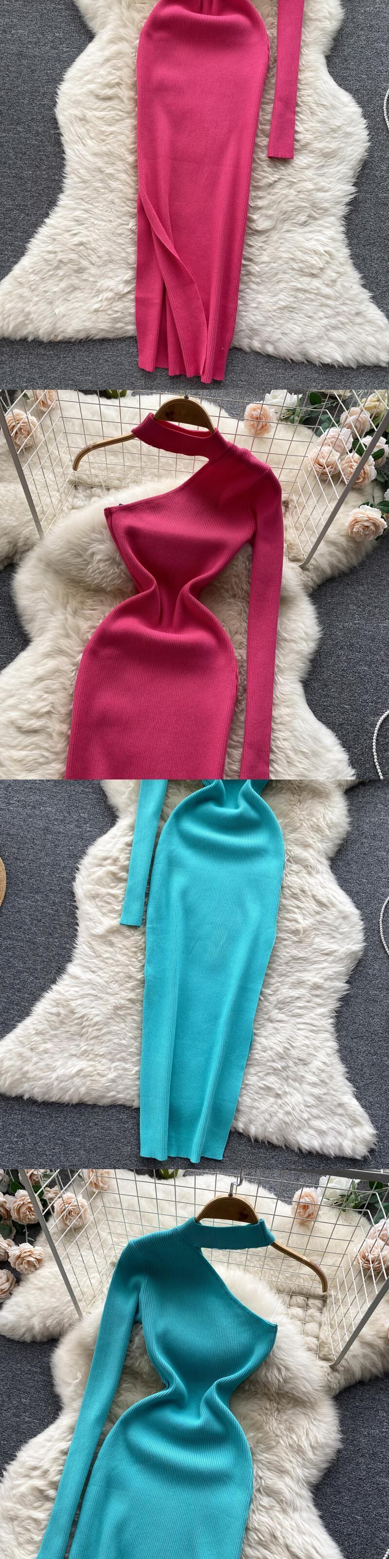 女性ワンショルダーニットペンシルドレス長袖弾性スリムドレス秋冬セクシーなボディコン暖かいセータードレス ロング エラスティック 伸縮 オータム 秋物 ウィンター 冬物 Abe22226698995