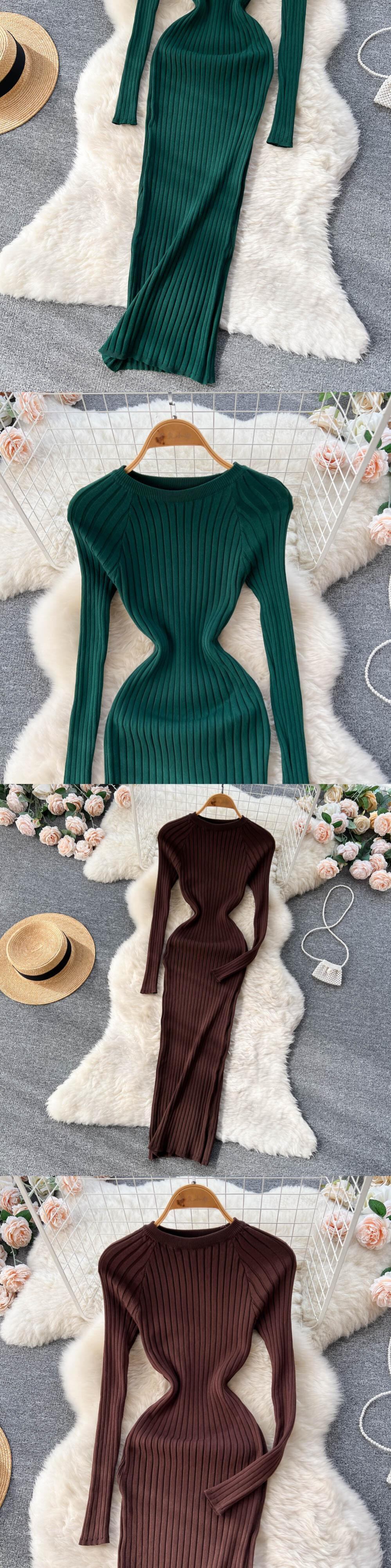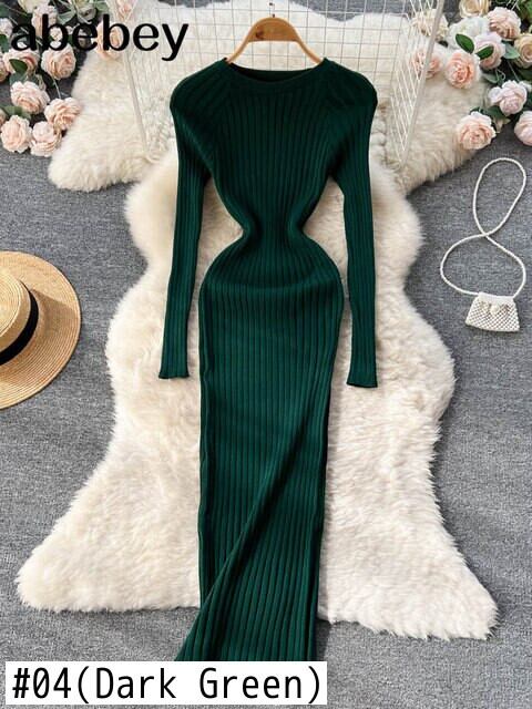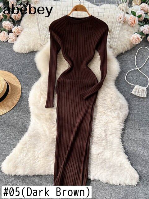 女性秋ニットドレス O ネックセクシーなスリム弾性特大の基本的なボディコンロングドレス冬のニット暖かいセータードレス エラスティック 伸縮 オータム 秋物 ウィンター 冬物 Oネック Abe81114998657