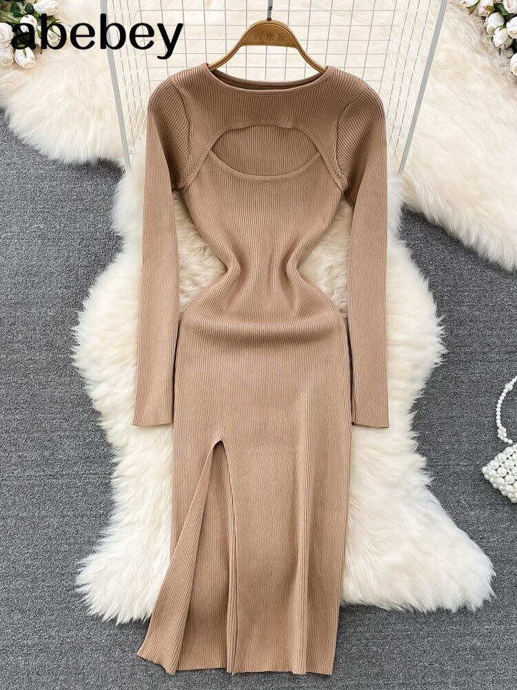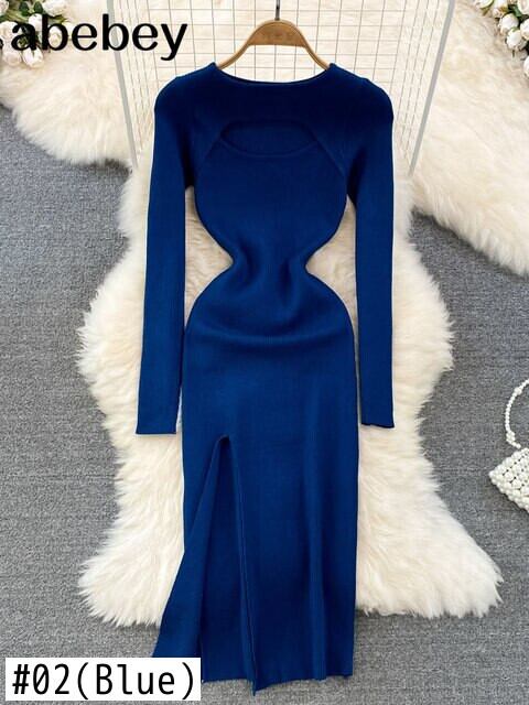 中空セクシーなニットドレスロングスリーブ O ネック弾性ウエストセーター 2022 無地分割秋の暖かいドレス 長袖 エラスティック 伸縮 オータム 秋物 Oネック ソリッドカラー Abe93410478317