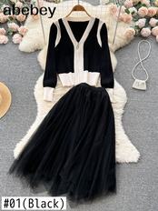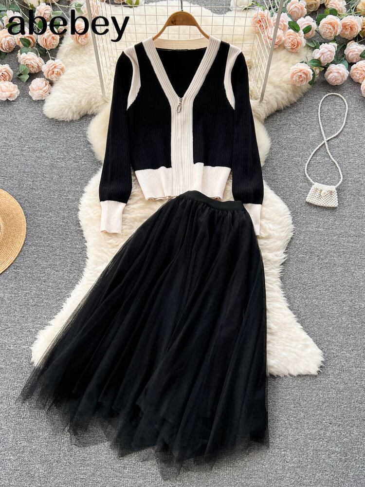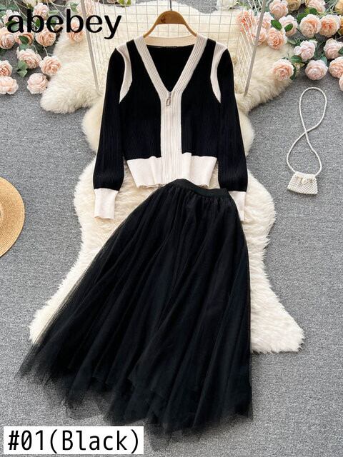 冬のニット 2 点セット女性長袖ニットセーターカーディガンとウエストメッシュロングスカートセット女性 ウィンター 冬物 Abe76354132927