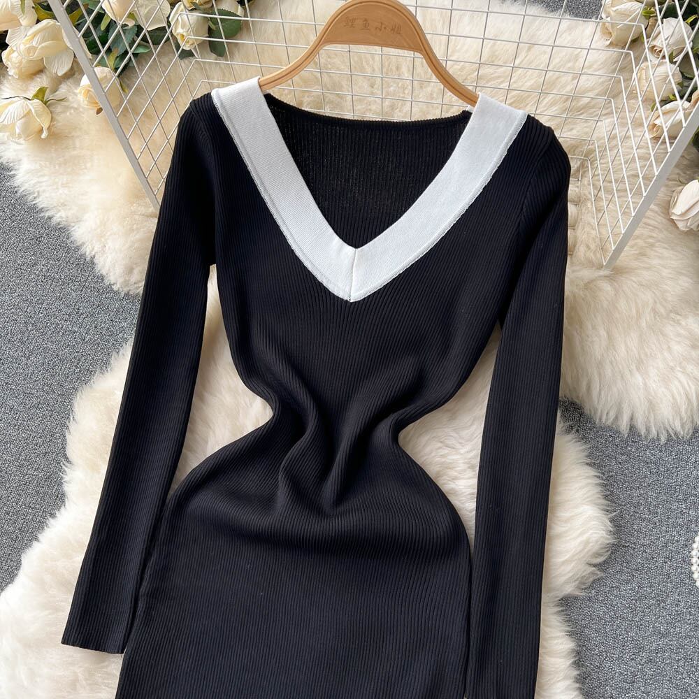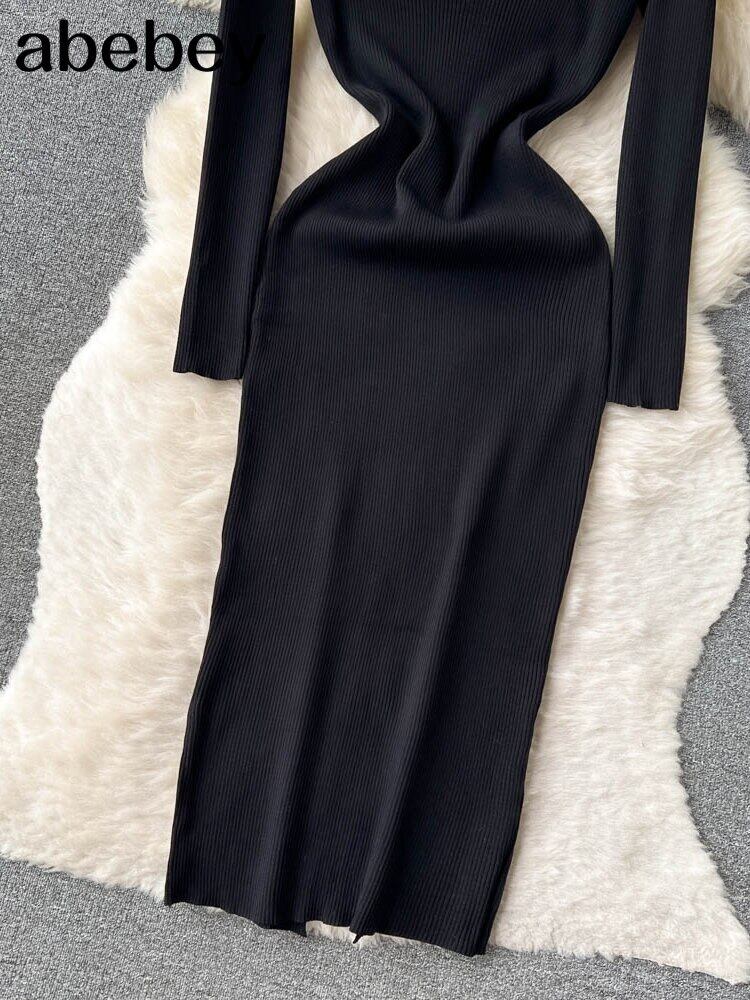 秋のセクシーなニットドレス女性 V ネック長袖スリムマキシドレス秋黒セーターロングドレス 2022 ブラック オータム 秋物 Vネック Abe52620813328