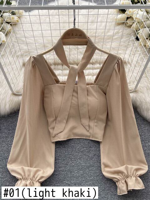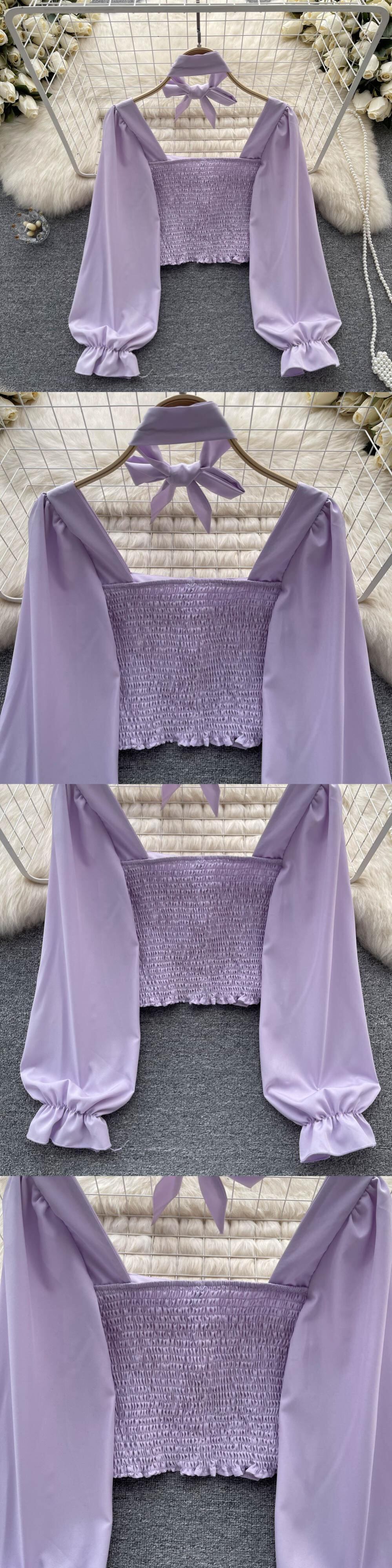 インショートトップス女性 2022 春秋パーティースクエアカラースリム長袖シャツ無地ブラウス ロング スプリング 春物 オータム 秋物 ソリッドカラー スクウェア Abe55355559248