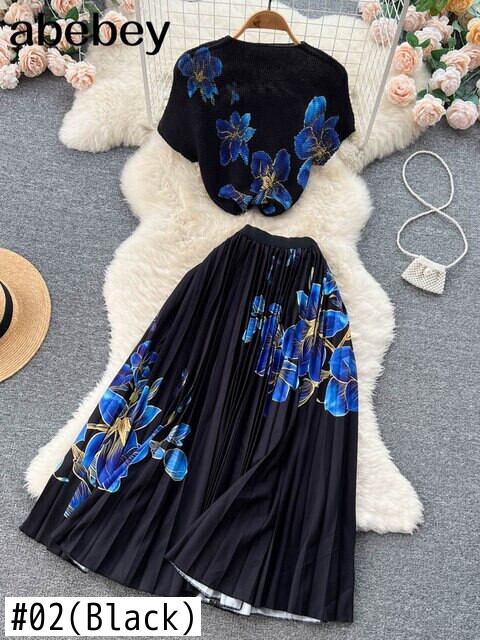 ボヘミアンバケーションビーチ 2 個セット女性花柄プリント半袖トップスとウエストプリーツロングスカートスーツ春夏 ショート ハーフスリーブ スプリング 春物 サマー 夏物 Abe75079675497