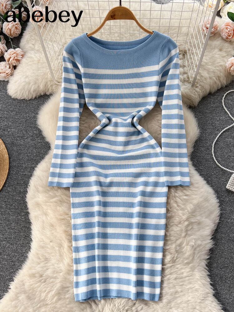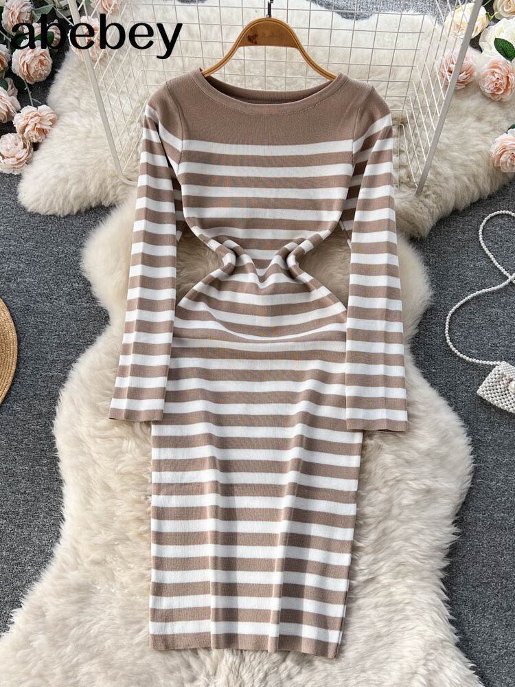 ストライプ ドレス O ネック セクシーな女性ボディコン マキシ ドレス スリム ニット プルオーバー長袖ミディ リブ ローブ ロング Oネック Abe4418908188