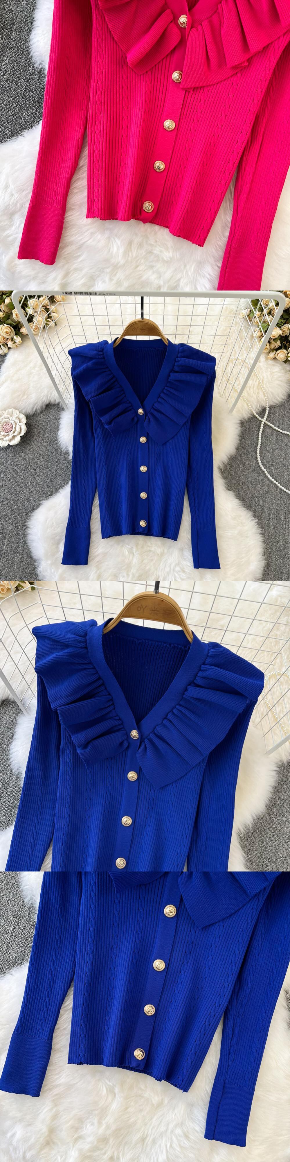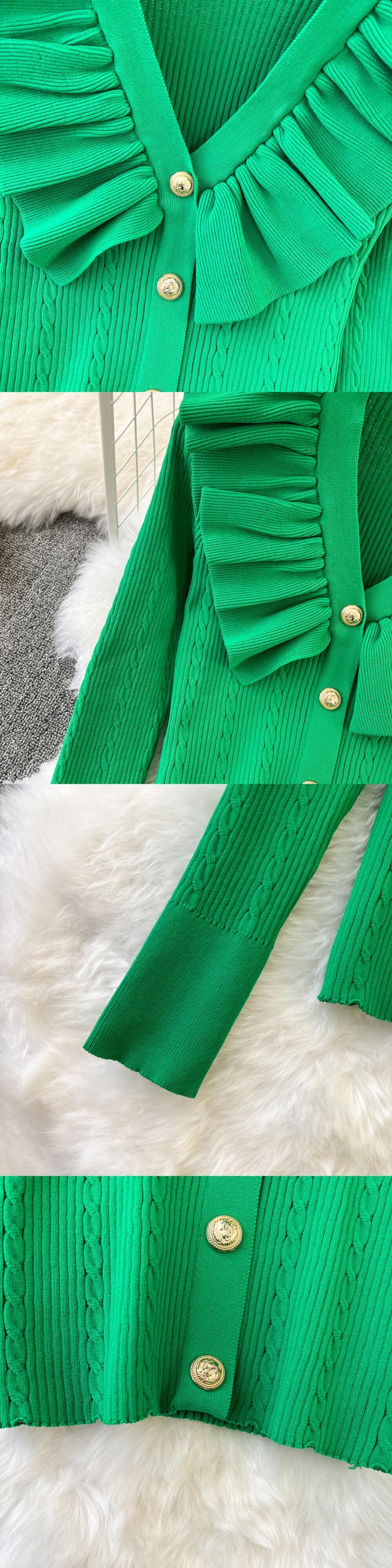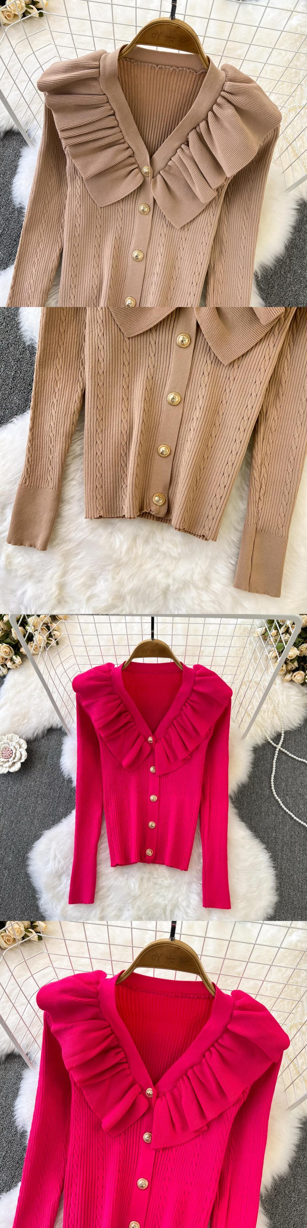 フリル Vネック カーディガン セーター 長袖 シングルブレスト ストレート スリム プルコート 秋 ニット ロング ラッフル オータム 秋物 Abe3101797149