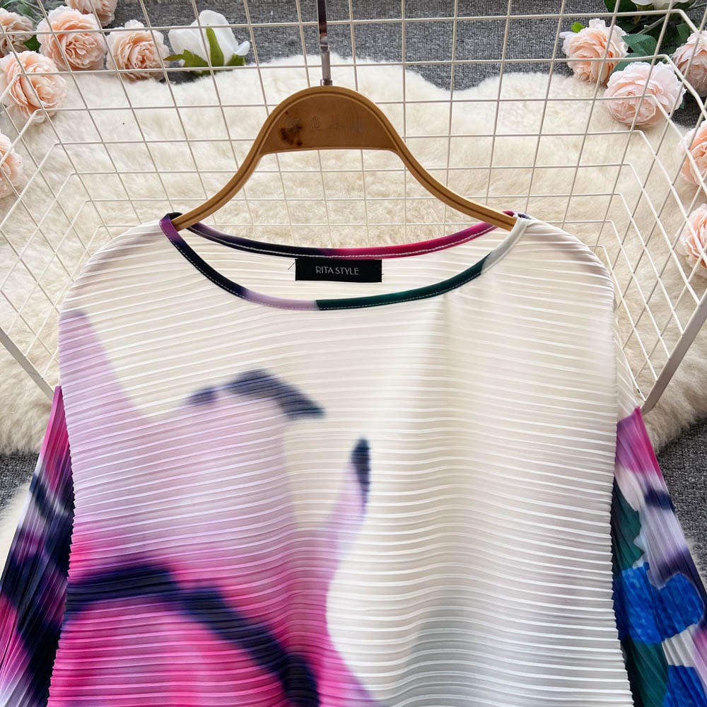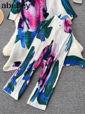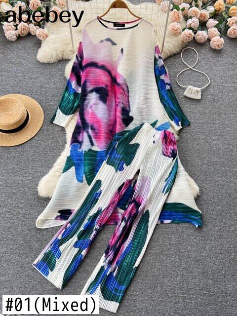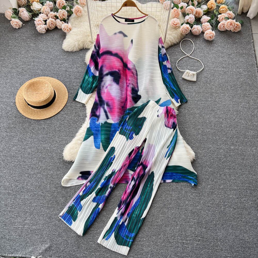 ボヘミアンバケーションビーチ 2 個セット女性花柄プリント長袖トップスとウエストプリーツロングパンツスーツ春夏 スプリング 春物 サマー 夏物 Abe21751527098