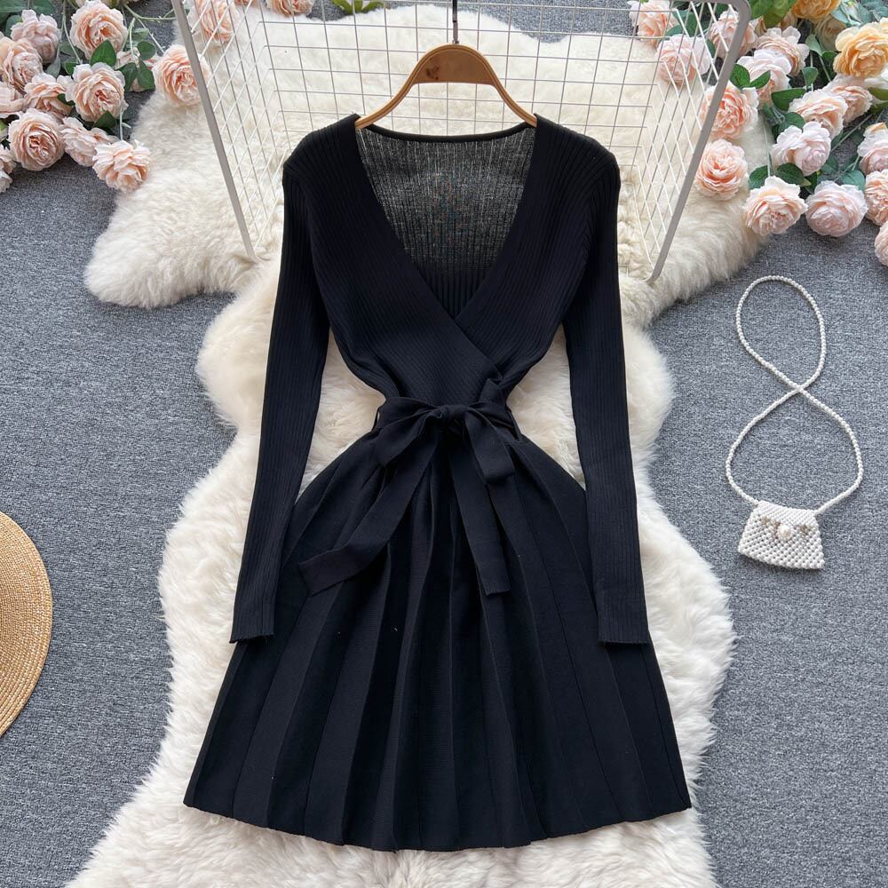 ディープ V ネック ニット秋の女性ドレス長袖ソリッド スリム弾性ウエスト A ライン ロング暖かいセーター ドレス エラスティック 伸縮 オータム 秋物 Vネック Aライン ソリッドカラー Abe7118347423