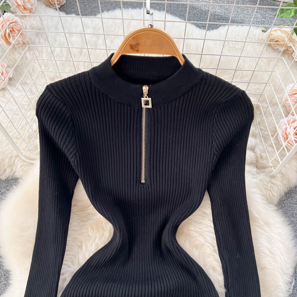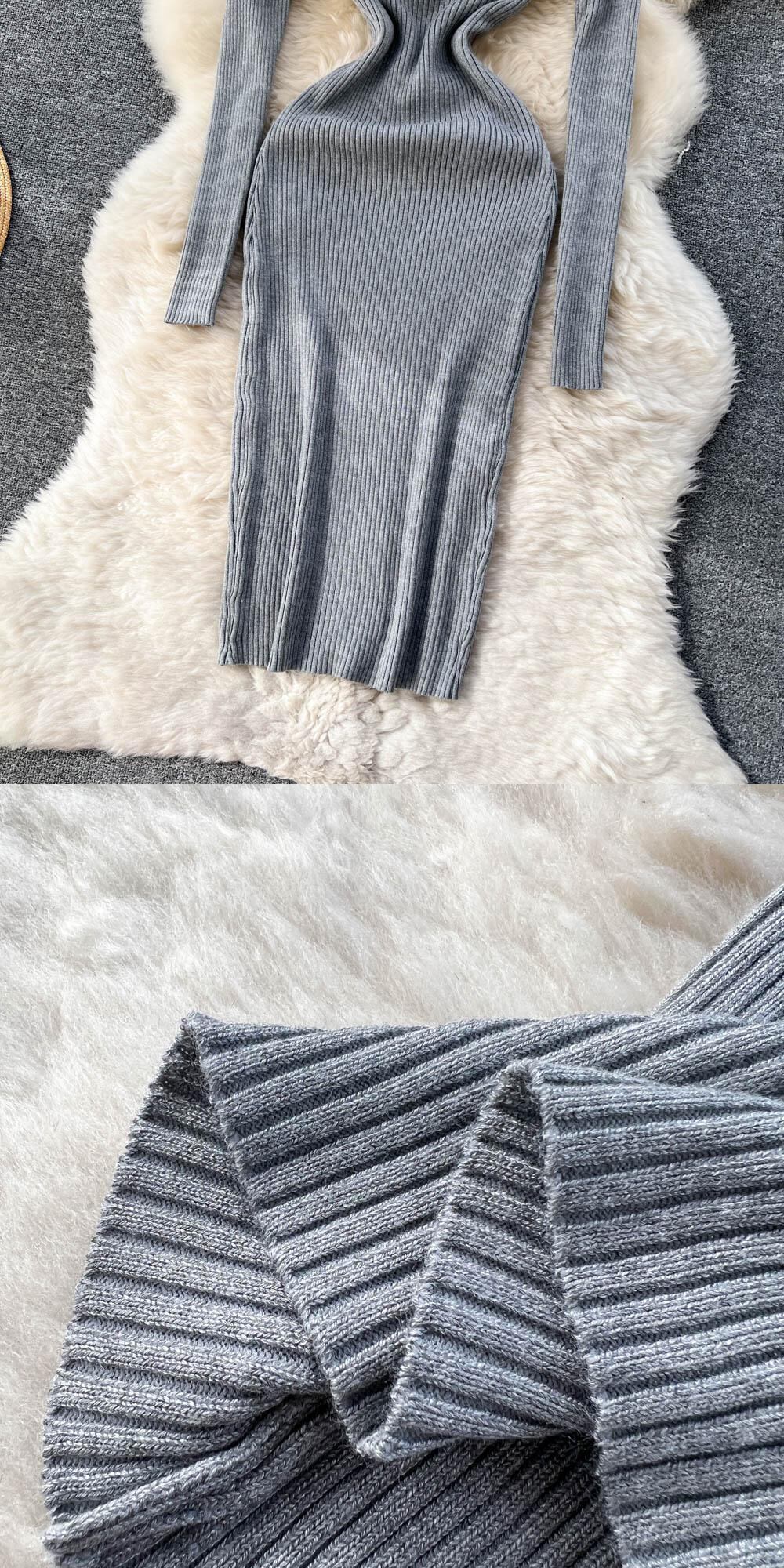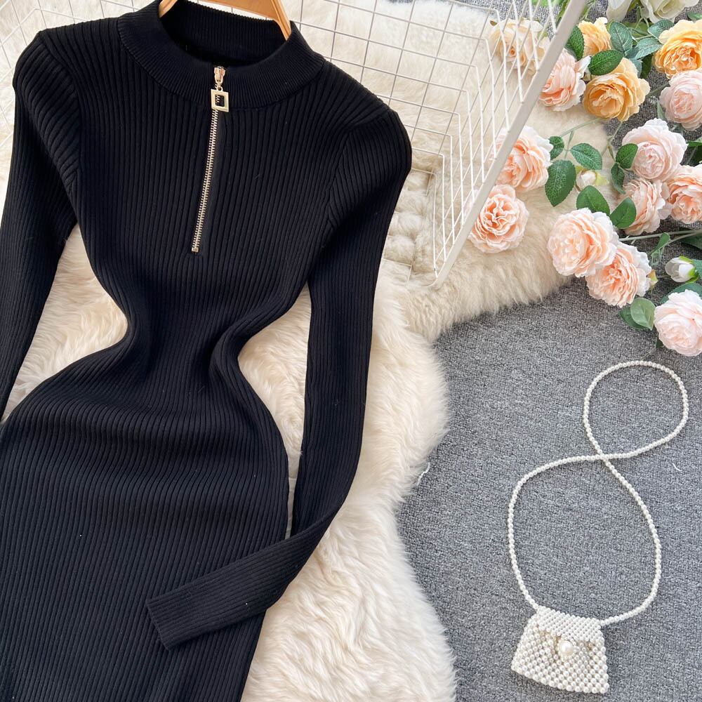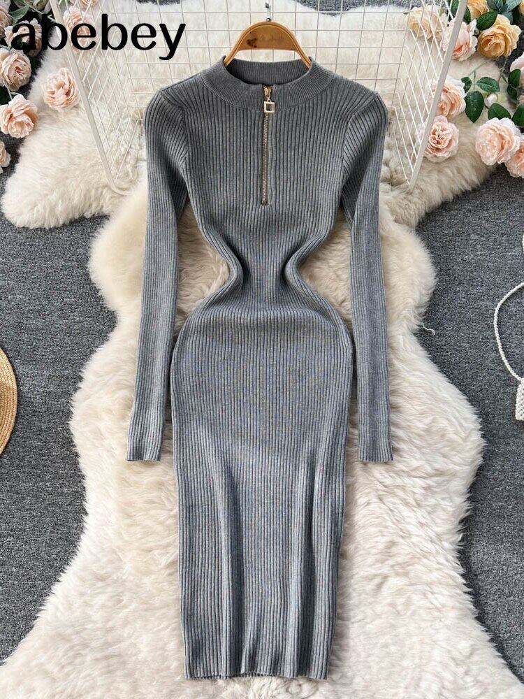 シックでセクシーなジッパー V ネックスリット長袖ボディコンドレス Vestidos スリム秋冬ペンシルセータードレス ロング オータム 秋物 ウィンター 冬物 Vネック Abe66671215035