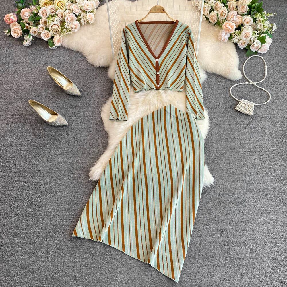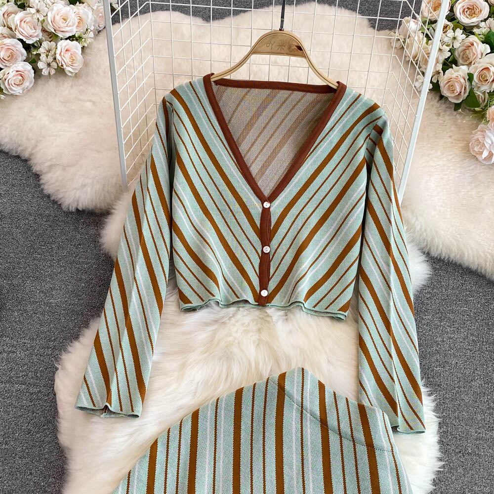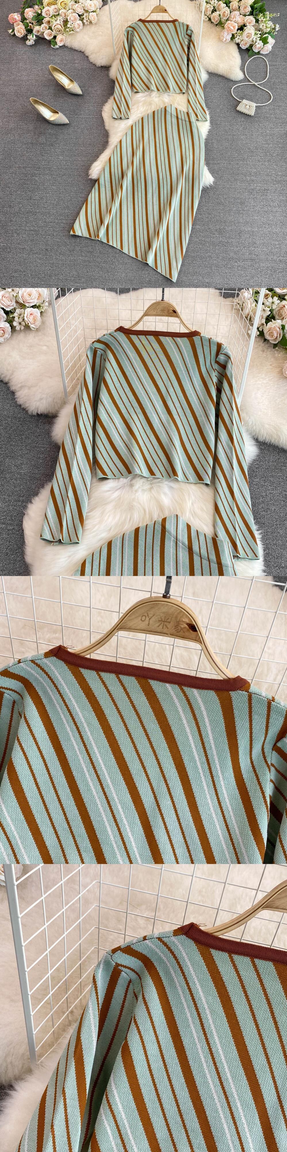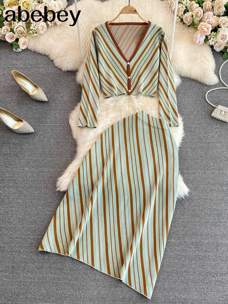 女性シックな 2 枚セット ウエスト セクシー ストライプ ラップ a 玲 ロング スカート + ロング スリーブ ニット カーディガン スリム セーター セット 長袖 Abe61938298499