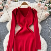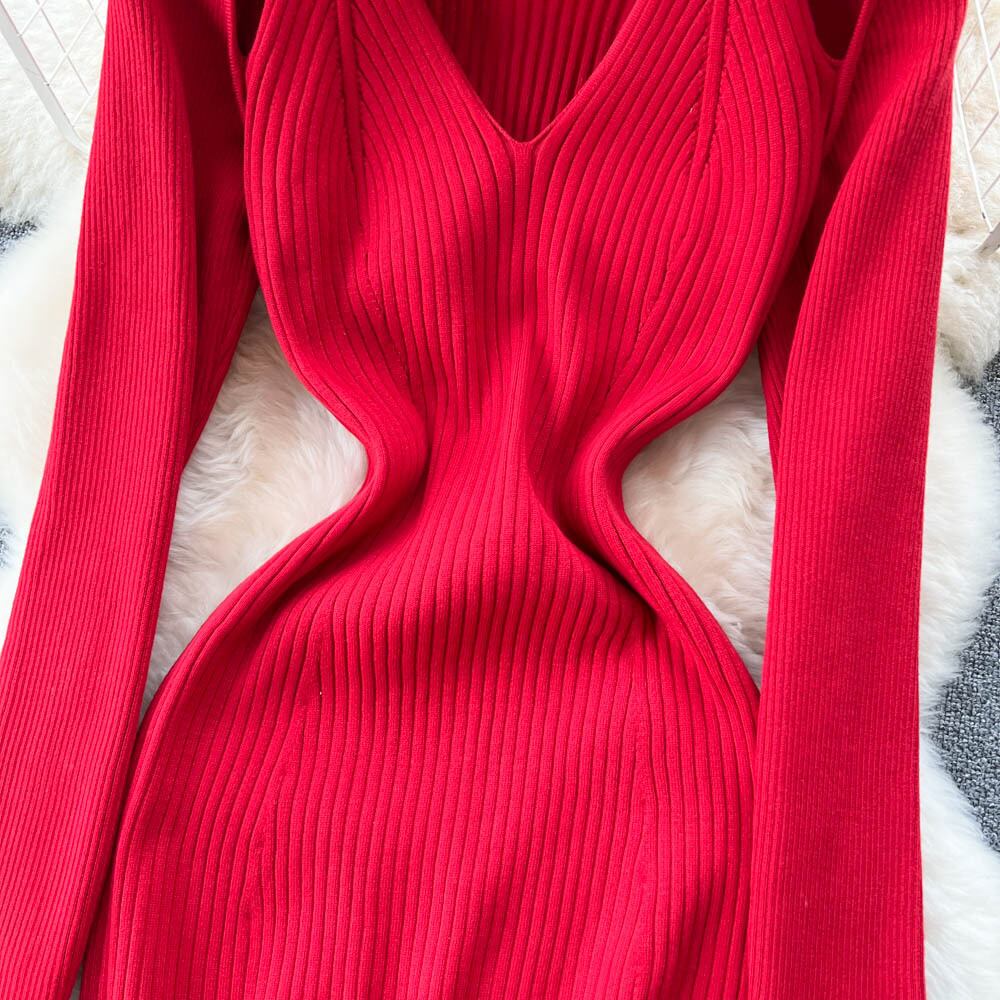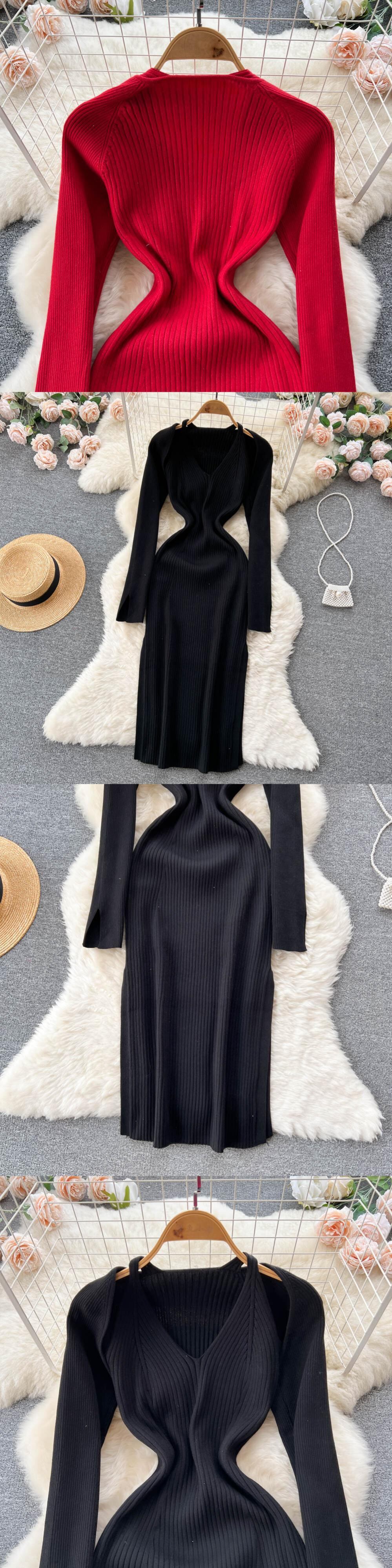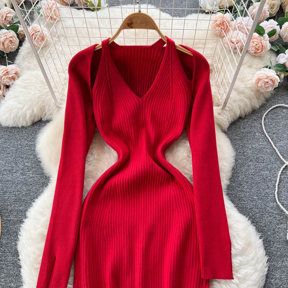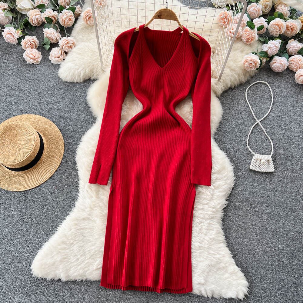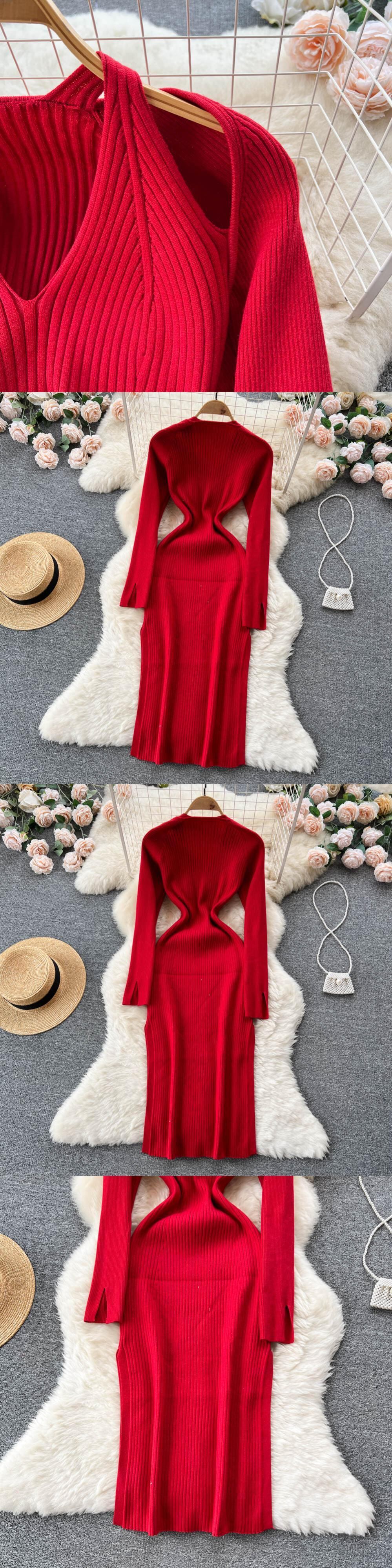 中空ニット ドレス V ネック長袖シース A ライン ドレス女性秋のパーティー ミディ ロング ドレス オータム 秋物 Vネック Aライン Abe58916932953
