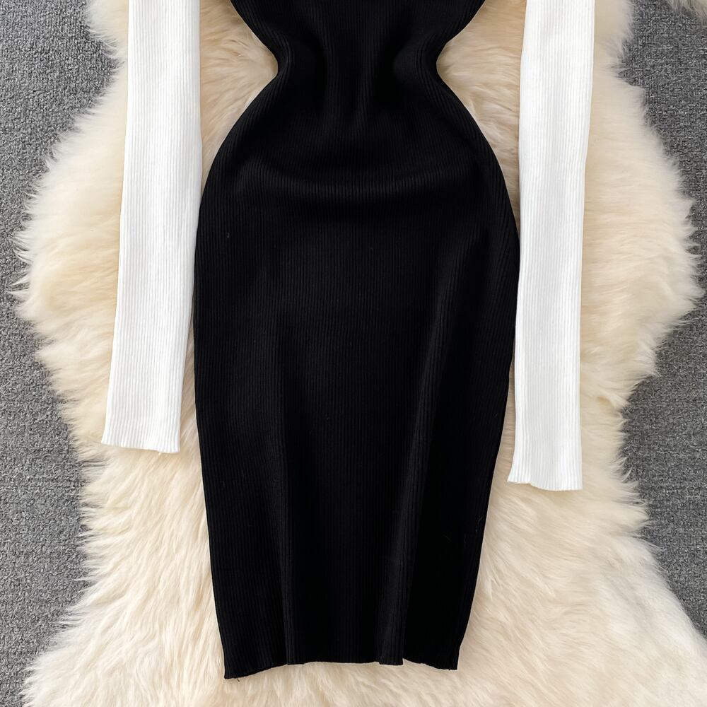 パッチワーク女性ニットペンシルドレス長袖 O ネック弾性スリムドレス秋冬セクシーなボディコン暖かいセータードレス ロング エラスティック 伸縮 オータム 秋物 ウィンター 冬物 Oネック Abe21563050118
