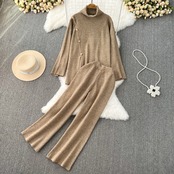 タートルネック長袖プルオーバートップ + ワイドレッグパンツスーツ衣装秋の女性の冬の 2 点セットセーター ロング オータム 秋物 ウィンター 冬物 ワイドパンツ Abe16967751155