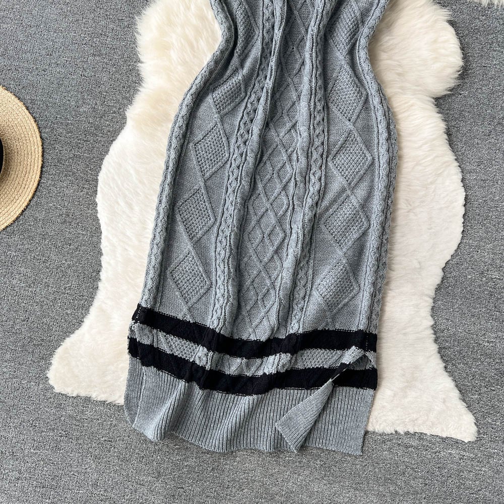 2022冬 セーターワンピース Vネック 麻デザイン ノースリーブ ルーズストレート ミディロング ニットワンピ ウィンター 冬物 Abe10053130742