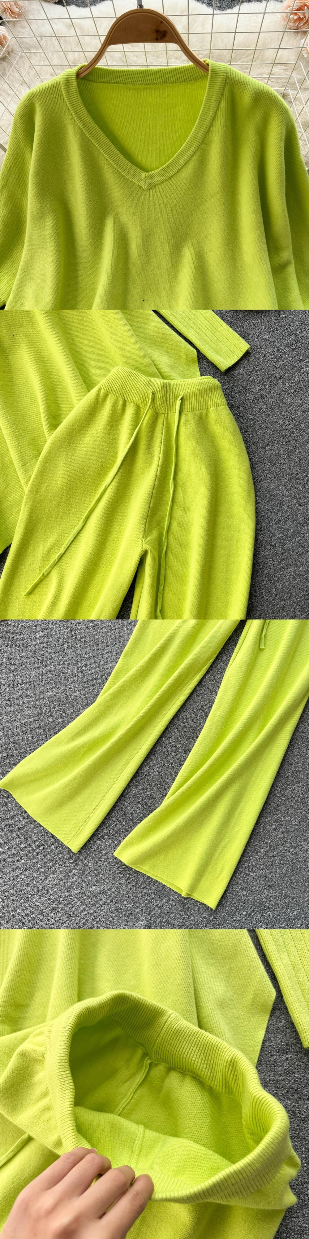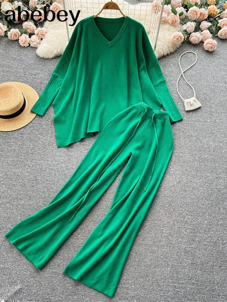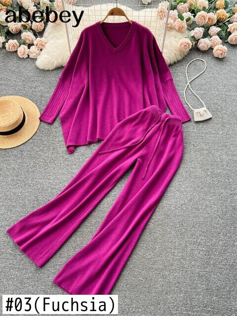 女性ニットツーピースセット 2022 冬の無地長袖スプリットセーター + ワイドレッグパンツ衣装ルーズセータースーツ ロング ウィンター 冬物 ワイドパンツ ソリッドカラー Abe40324904311