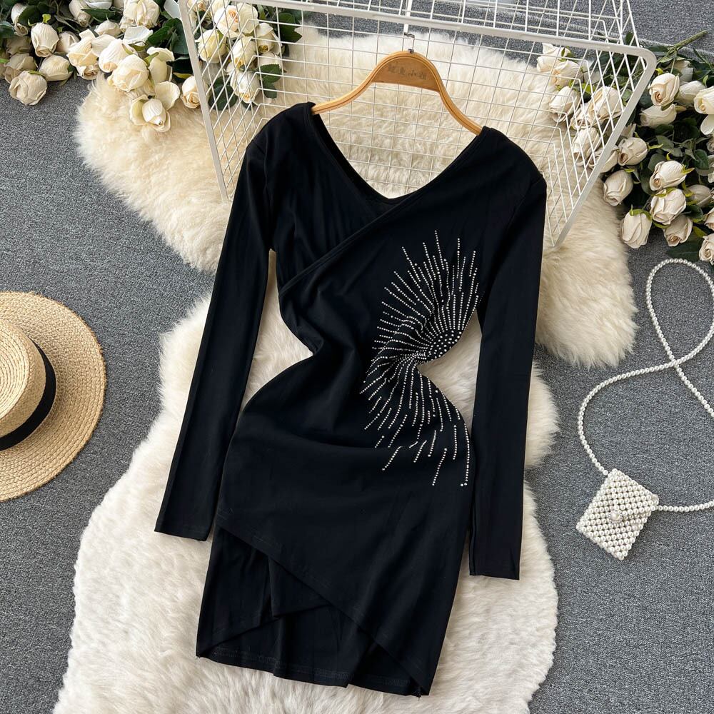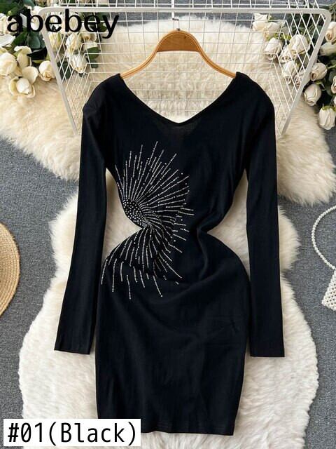 女性のセクシーな黒ブリンブリンダイヤモンドボディコンミニドレス春秋の V ネック長袖ウエストパーティー Vestidos ロング ブラック スプリング 春物 オータム 秋物 Vネック Abe89482639477