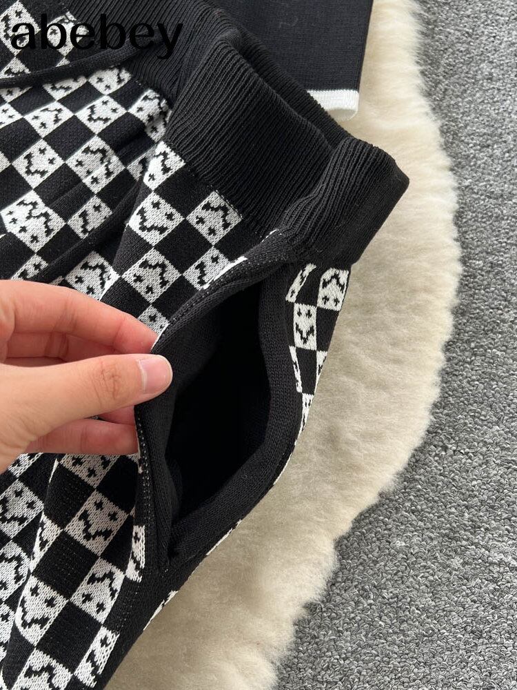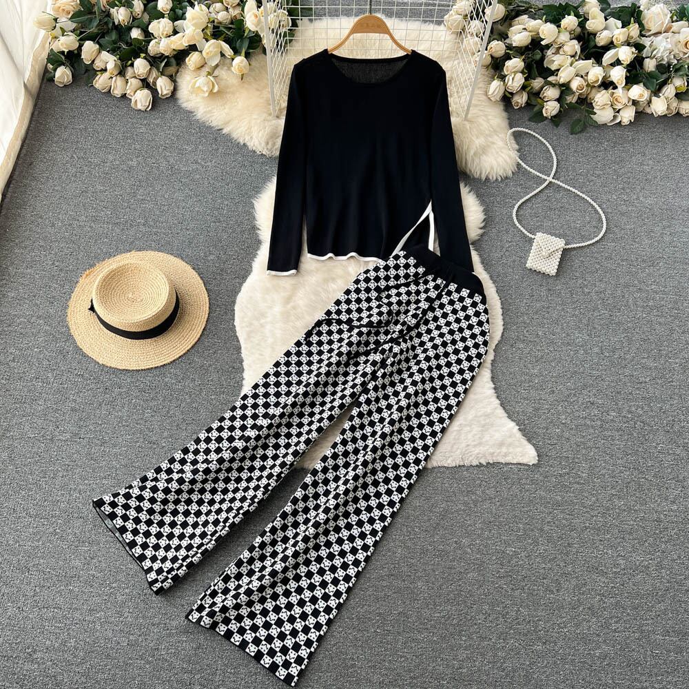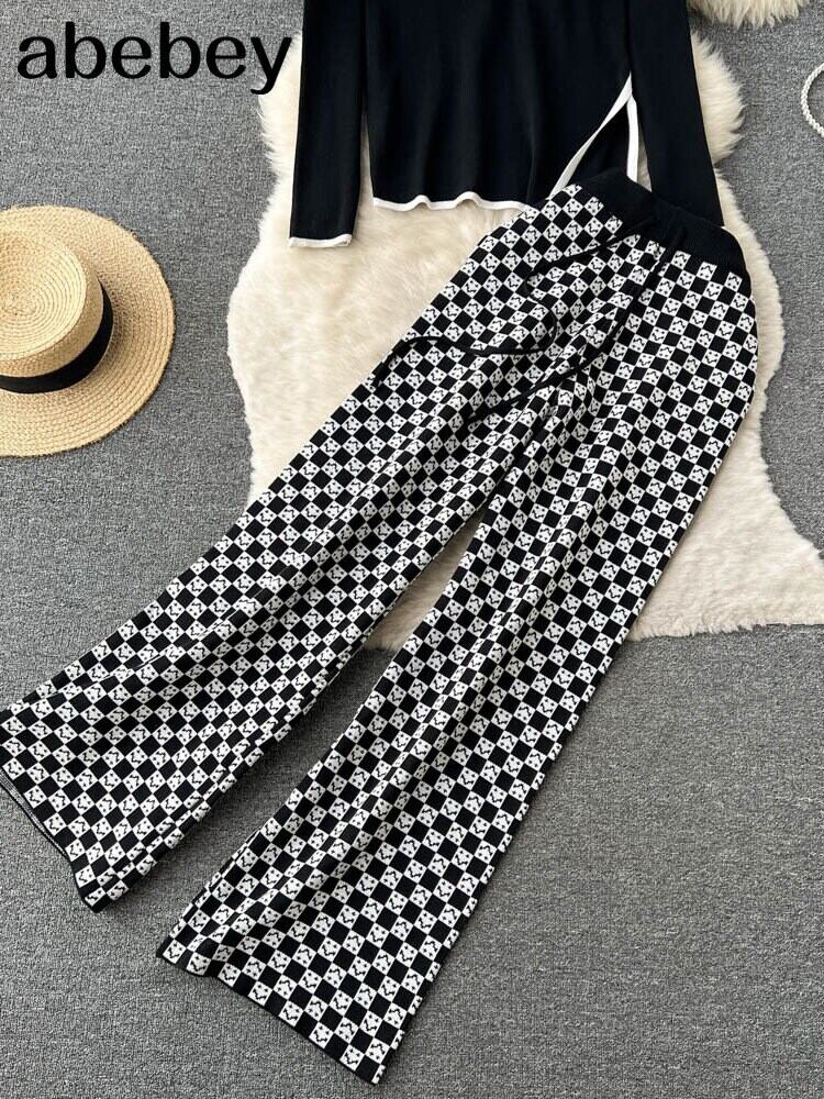 2022 冬の Paneled セータースーツルース長袖トップ + ストレートワイドレッグパンツ女性 OL ニット 2 点セット ロング ウィンター 冬物 ワイドパンツ Abe9163260050