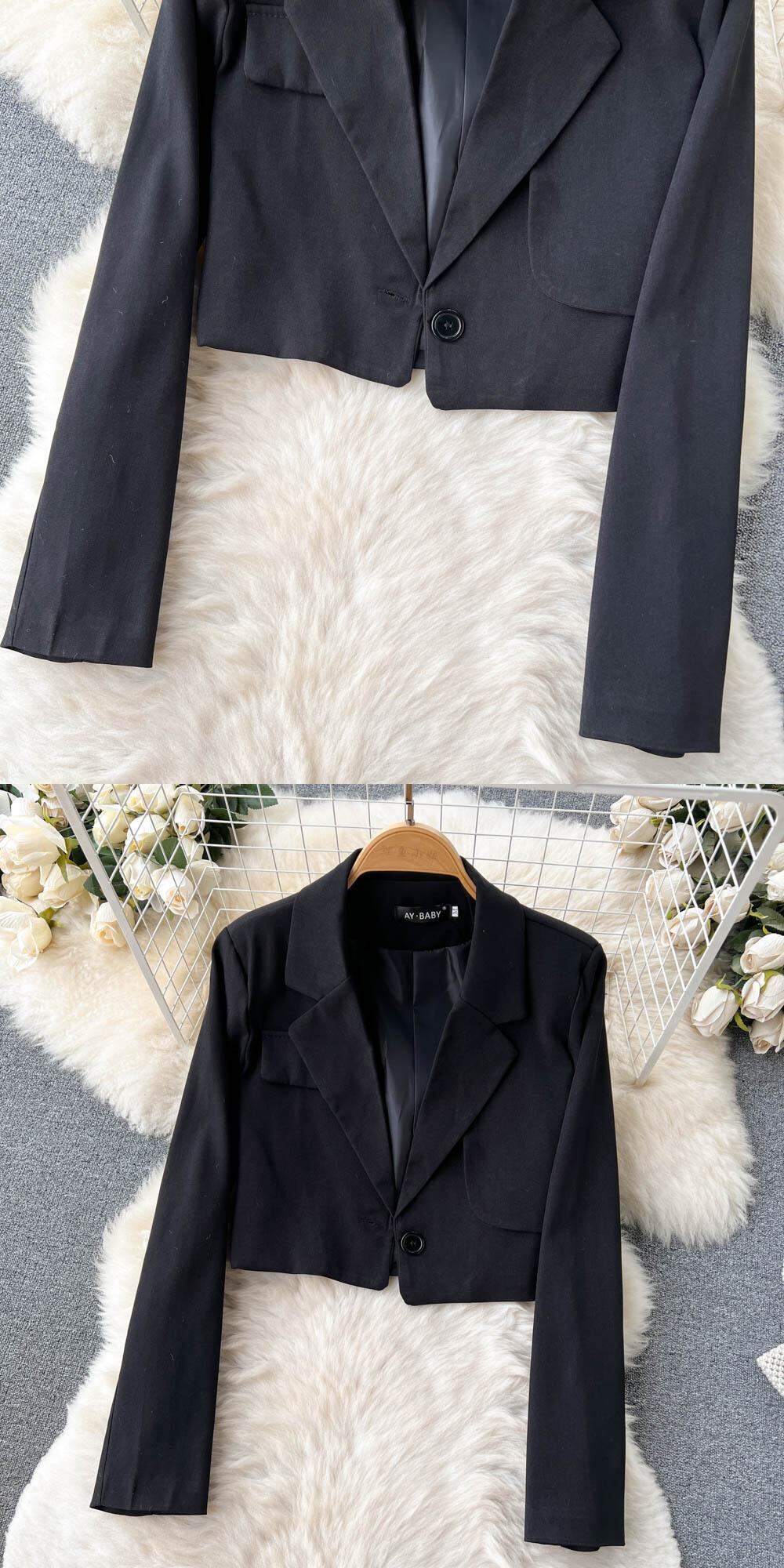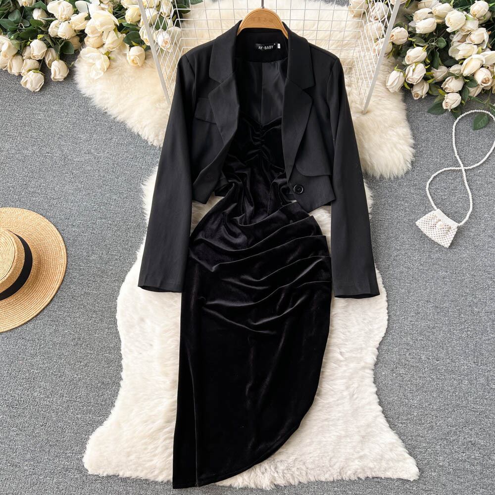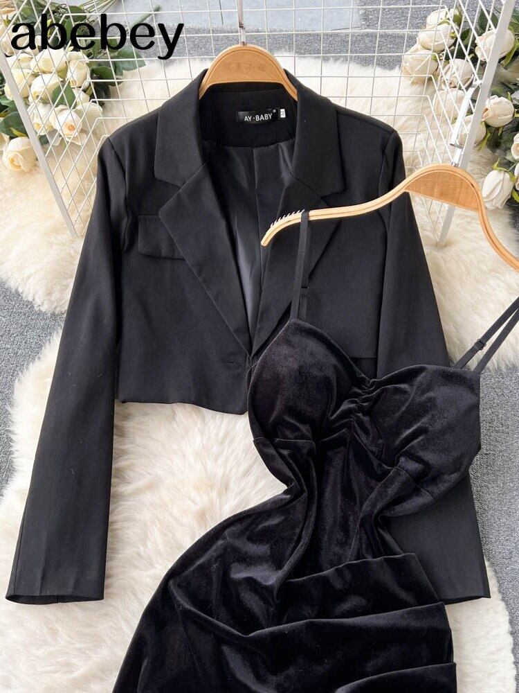 秋黒ツーピースドレスセット女性ブレザーコート + ストラップドレスセットスリムドレススーツ 2022 ブラック オータム 秋物 Abe79112642202