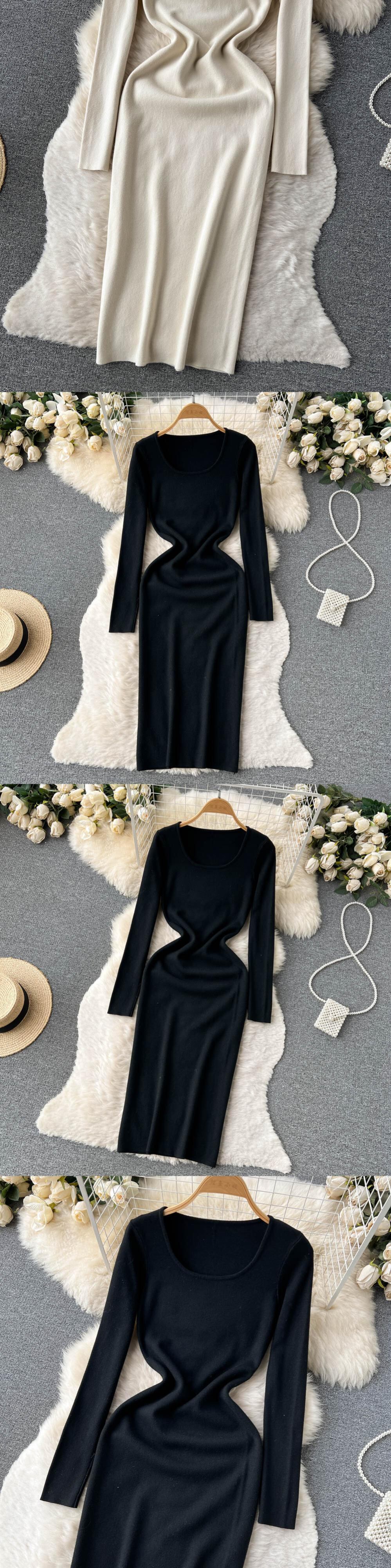 スクエアネック秋ニットマキシドレス長袖弾性ウエストセクシーなニットドレス女性スリム暖かいセーターロングドレス エラスティック 伸縮 オータム 秋物 スクウェア Abe9980857782