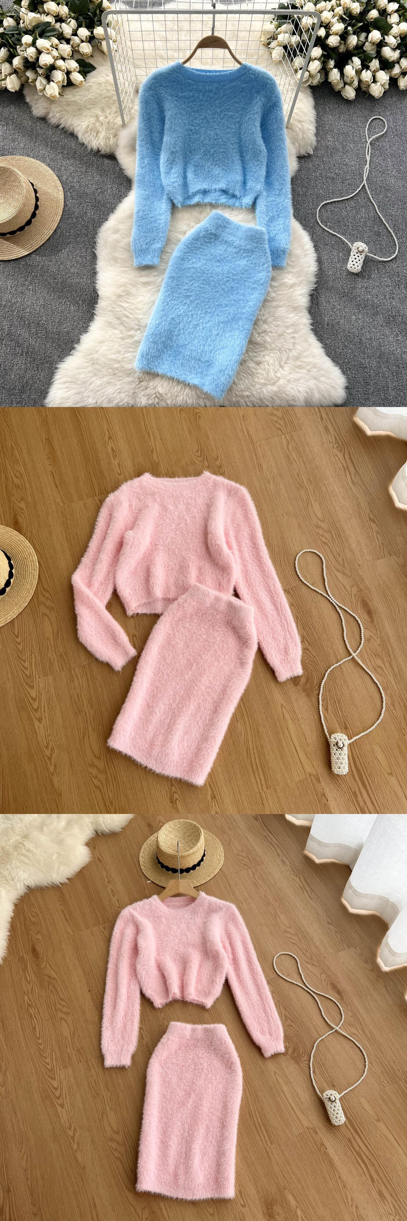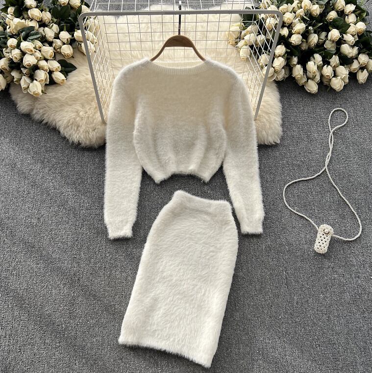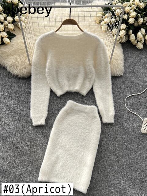冬絨毛女性セータースーツショートニットトップ + ウエストスリムスカート甘いストリートニット二枚セット 大人ガーリー スウィート キュート カジュアル ウィンター 冬物 Abe19838283556