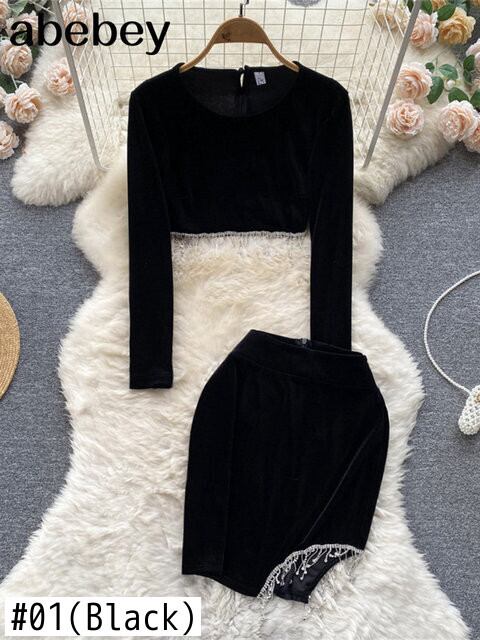 黒人女性ニットツーピーススーツショートコートクロップトップ + ショートスカート冬 A2K セーターセット衣装 ブラック ウィンター 冬物 Abe41199208023