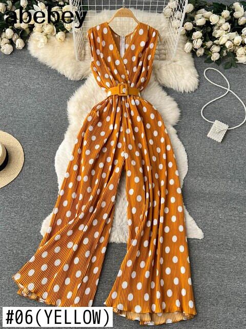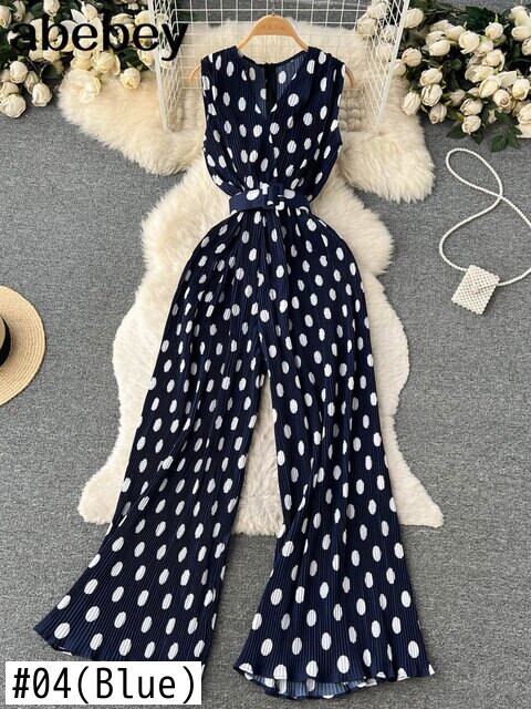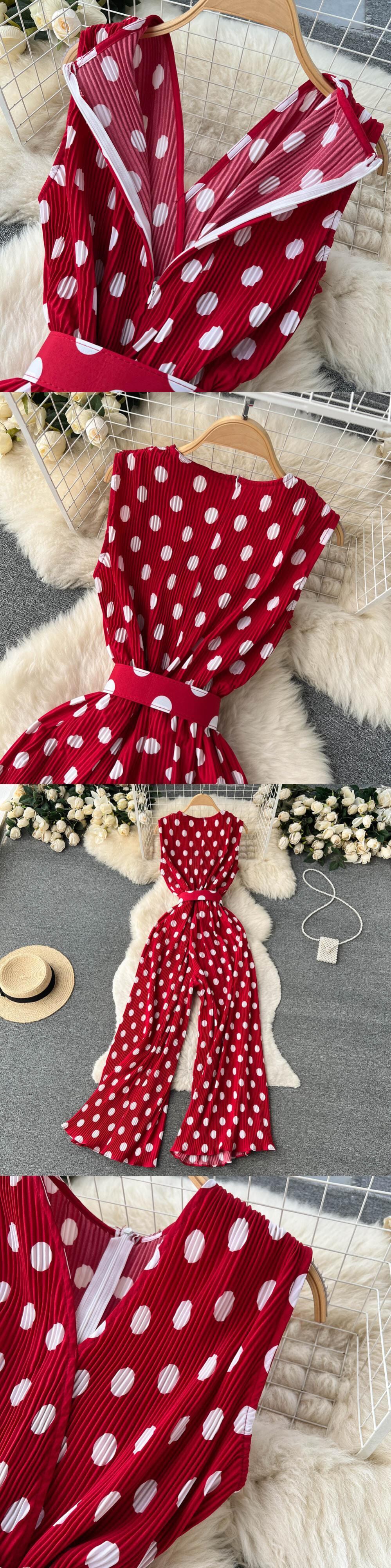 夏の女性ホルターポルカドット V ネックジャンプスーツ背中の開いたスリムウエストワイドレッグパンツロンパース服 サマー 夏物 Vネック Abe8901460734