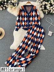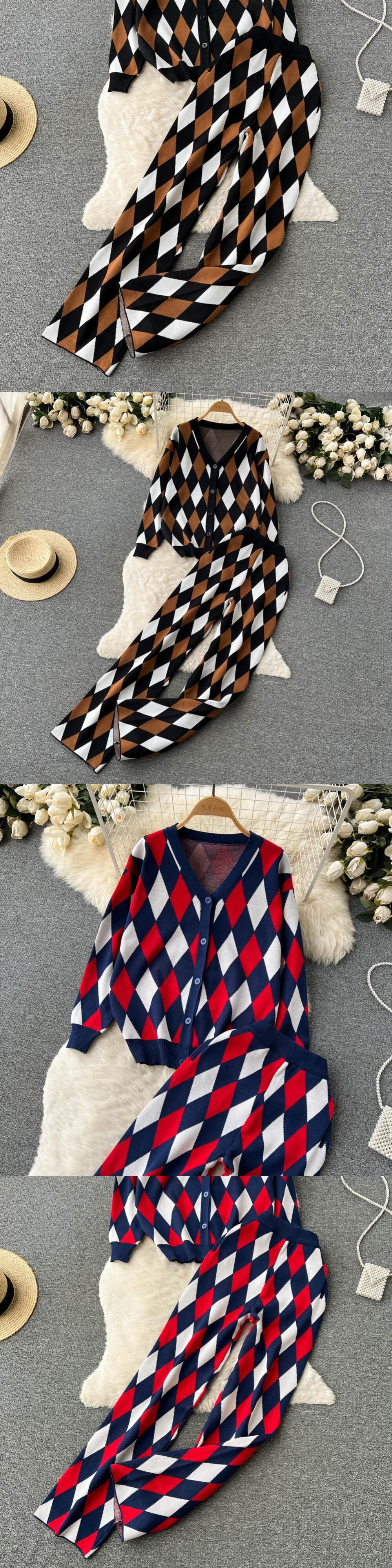 冬のレトロなチェック柄ニットセットシングルブレスト V ネックカーディガン + 弾性ワイドレッグロングパンツ女性セーター二枚スーツ エラスティック 伸縮 ウィンター 冬物 Vネック ワイドパンツ Abe63055421507