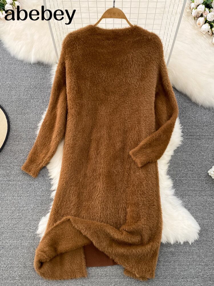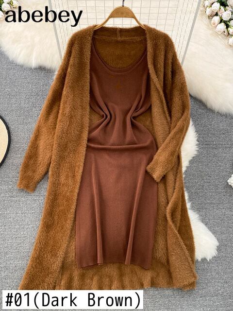 2022 ニット女性セットルーズ長袖カーディガンセーター + 固体弾性ドレスフレンチスタイルのツーピースセット衣装 ロング エラスティック 伸縮 ソリッドカラー Abe92845368924