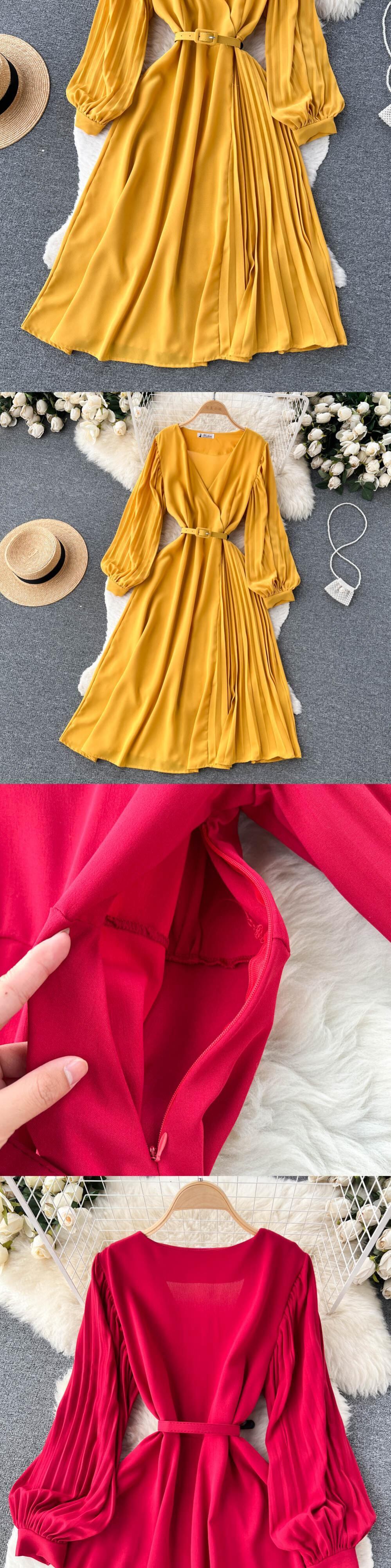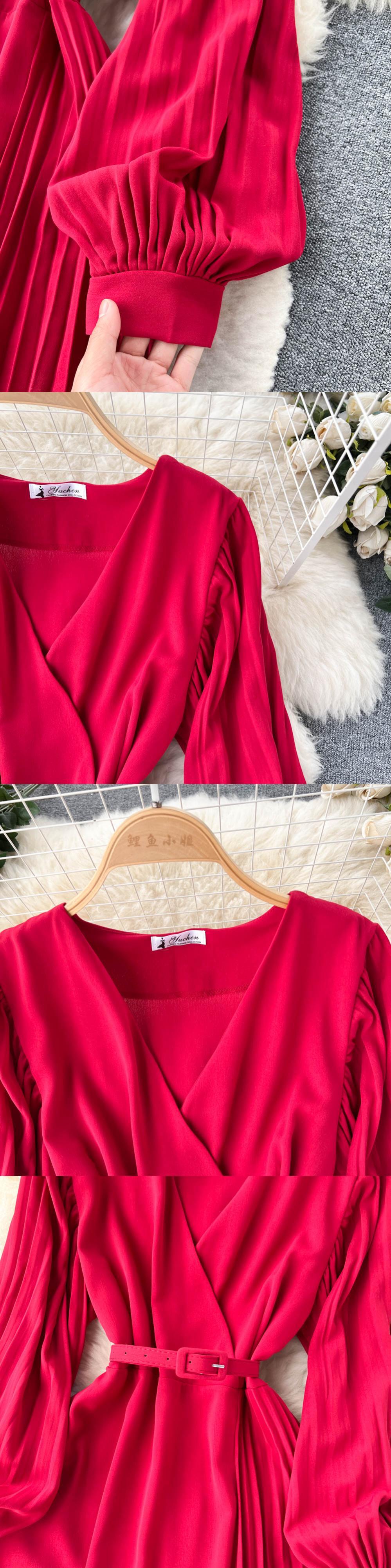 春秋の女性 V ネック長袖プリーツドレスオフィスレディスリムウエスト A ラインドレスベルト ロング スプリング 春物 オータム 秋物 ハーネス Vネック Aライン 会社 学校 通勤や通学にも Abe56008630162