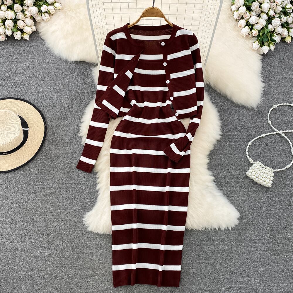 秋のレトロな野生の薄い O ネック長袖ストライプ カーディガン ニット コート クロップ ラップ ヒップ セクシーなスパゲッティ ストラップ ドレス ミニ ロング オータム 秋物 Oネック Abe991287568