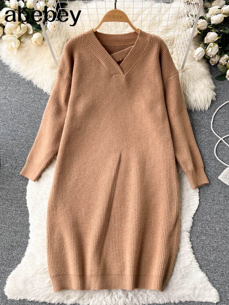 秋冬 V ネック ロング ストレート セーター ドレス女性特大セーター ドレス maix THICK ベーシック ニット ドレス オータム 秋物 ウィンター 冬物 Vネック Abe54757059369