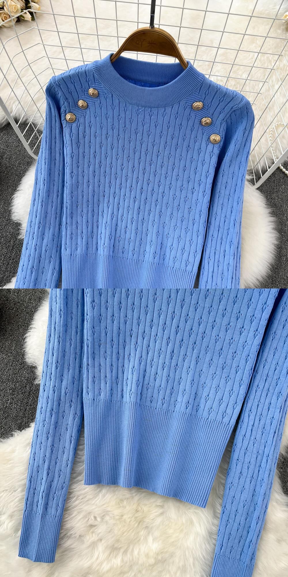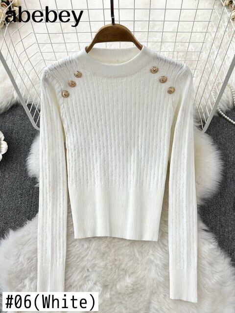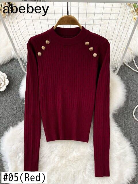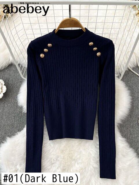 フルスリーブ O ネックセーターシャツ装飾ボタン女の子ストレッチクロップトップス秋のセータープルオーバー女性 オータム 秋物 Oネック Abe79927094306