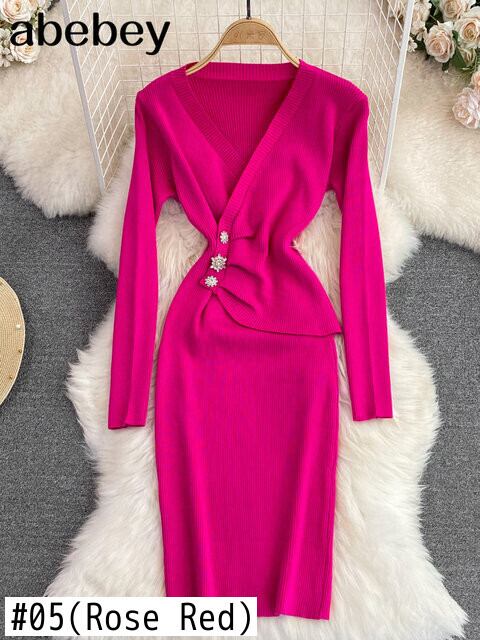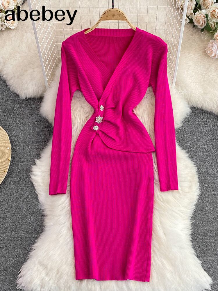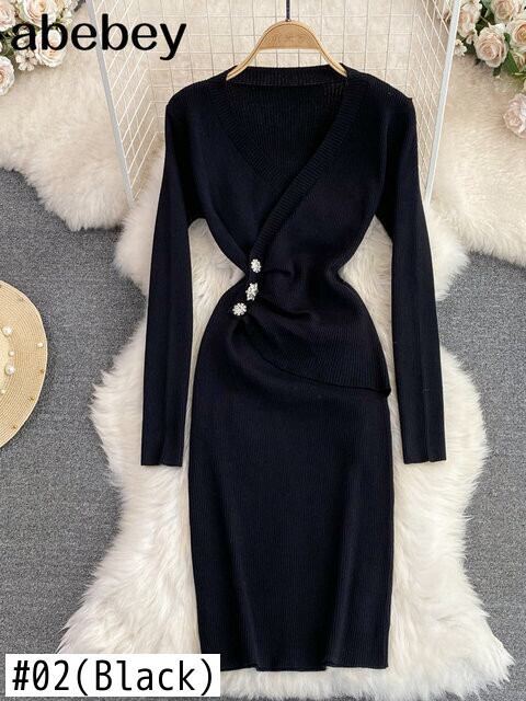 セクシーな bottons ニット ドレス冬フレンチ スタイル レースアップ長袖 v ネック女性パーティー固体ロング セーター ドレス ウィンター 冬物 Vネック ソリッドカラー Abe1605181031
