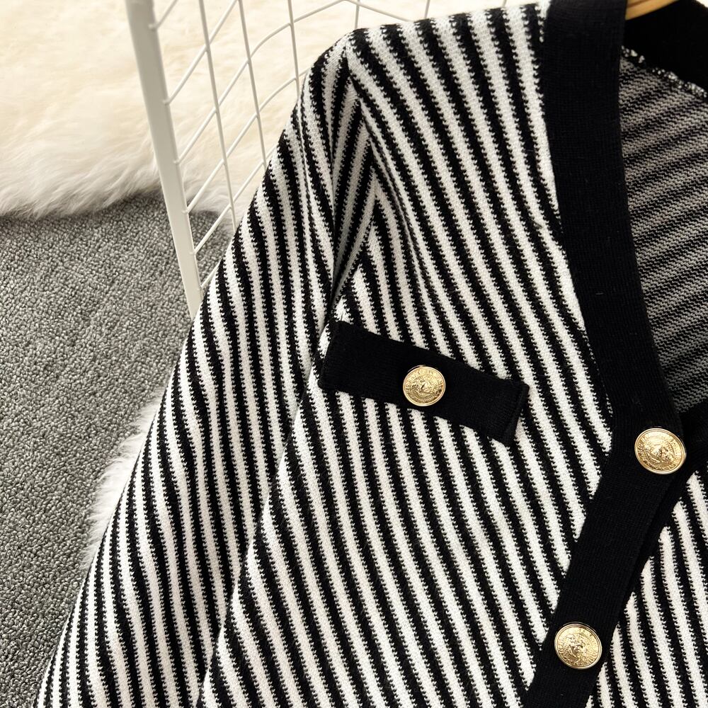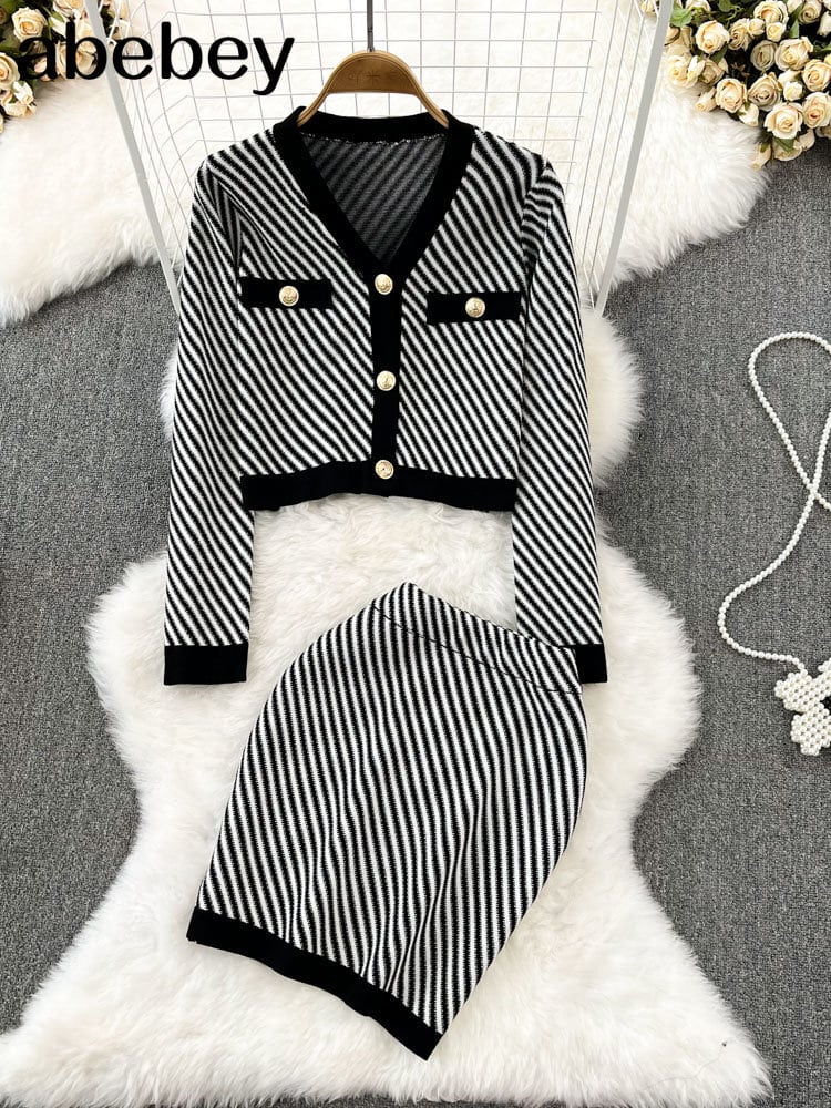 レトロストライプニットセット女性気質 V ネック長袖カーディガン + スリムミディスカート冬のプリントセーター二枚スーツ ロング ウィンター 冬物 Vネック Abe20053961988