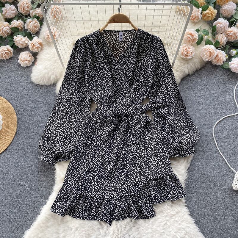 2022 春秋フレンチ V ネック長袖ドレスフリルハイウエストレースアップ水玉プリントミッドロング A ラインドレス ハイウェスト ラッフル スプリング 春物 オータム 秋物 Vネック Aライン Abe45267205175