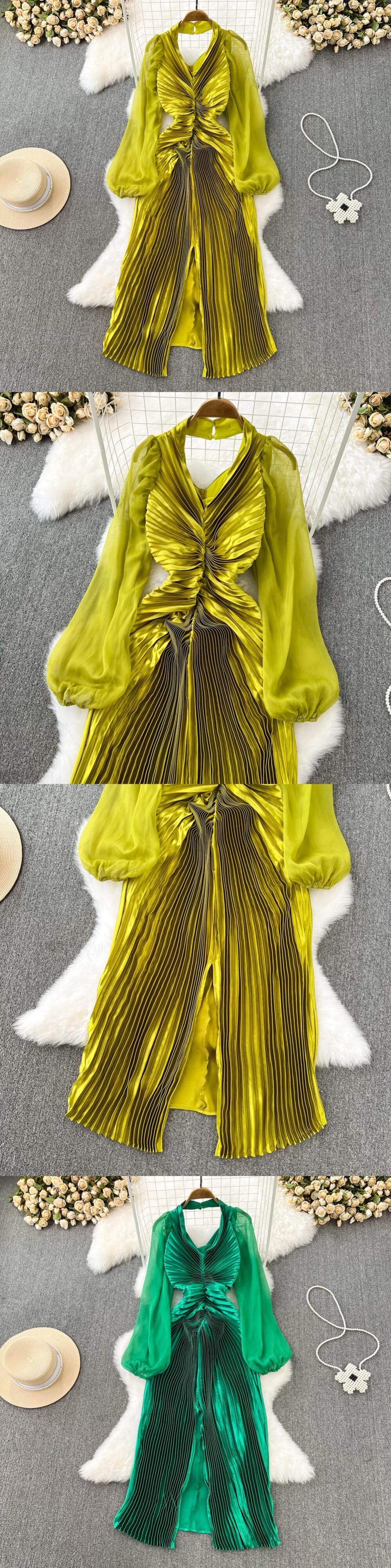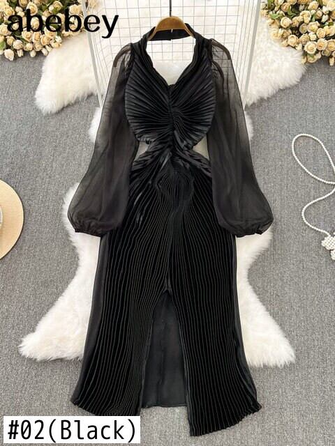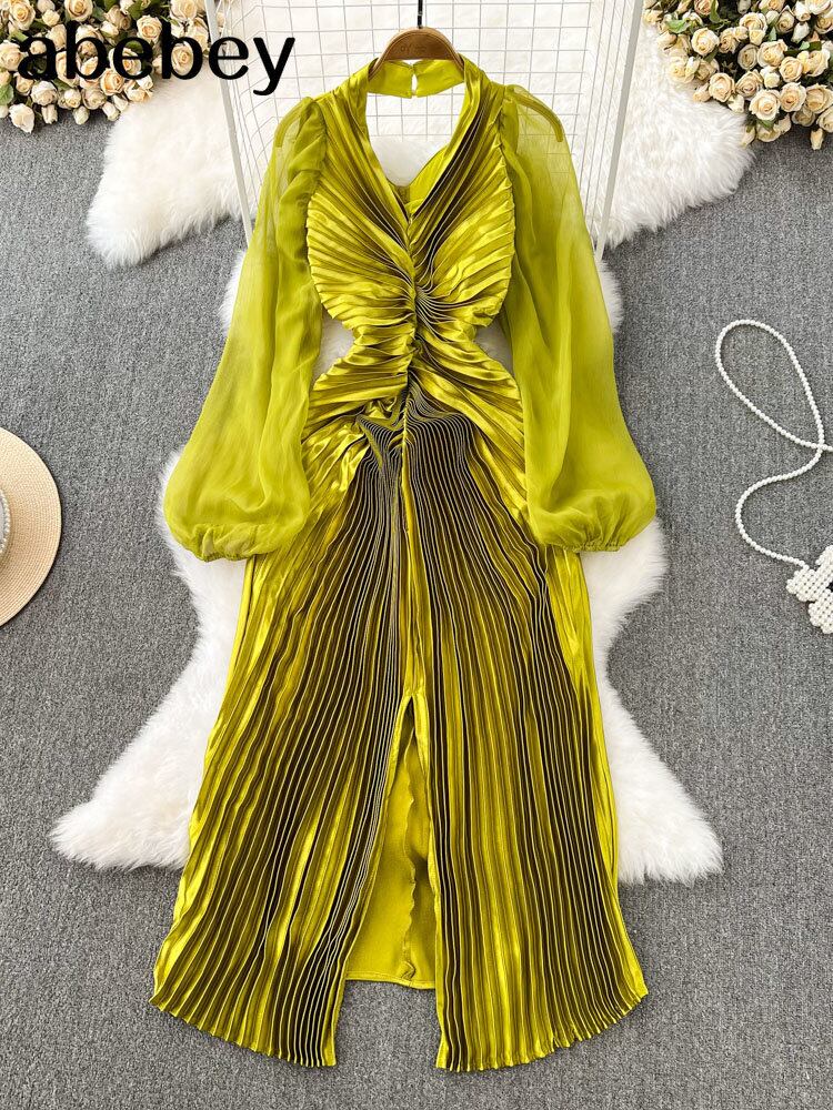 プリーツ Splid ウェディング パーティー ミディ ドレス女性 V ネック スリム長袖気質 2022 秋 ロング オータム 秋物 Vネック Abe48693081462
