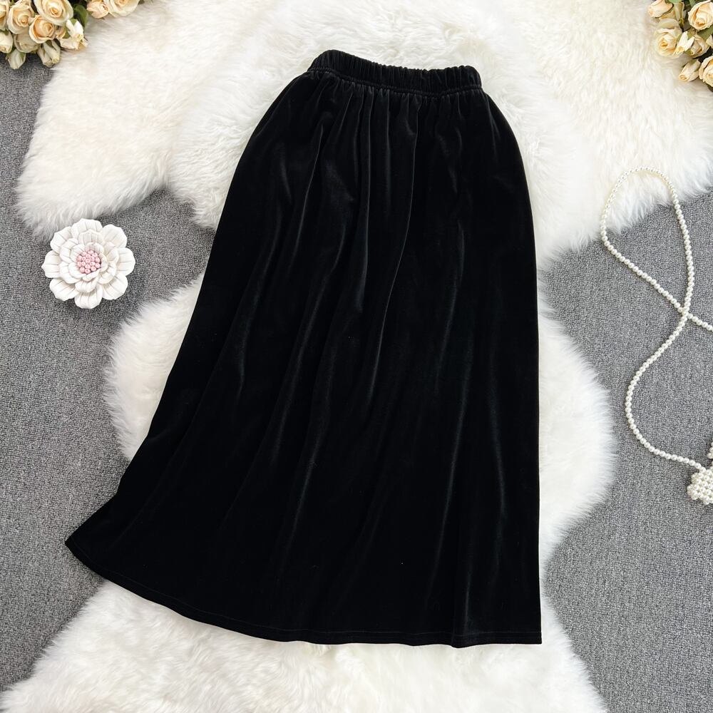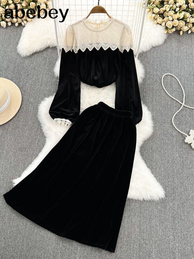ブラック ツーピース セット レディース Oネック パッチワーク ブラウス + ウエスト プリーツ ミディ スカート スーツ 春 スプリング 春物 Abe7012905808