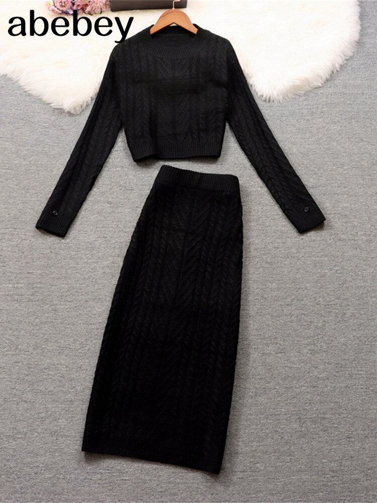 ツイストニットセータースカート 2 点セット女性スーツ 2022 新ソリッドショートトップス + 弾性ウエストミディロングスカートセット エラスティック 伸縮 ソリッドカラー Abe43205125017