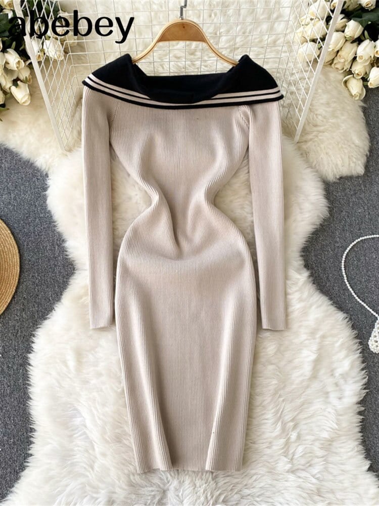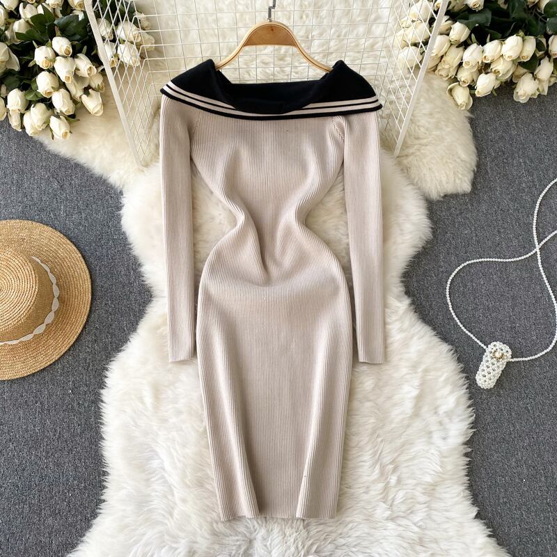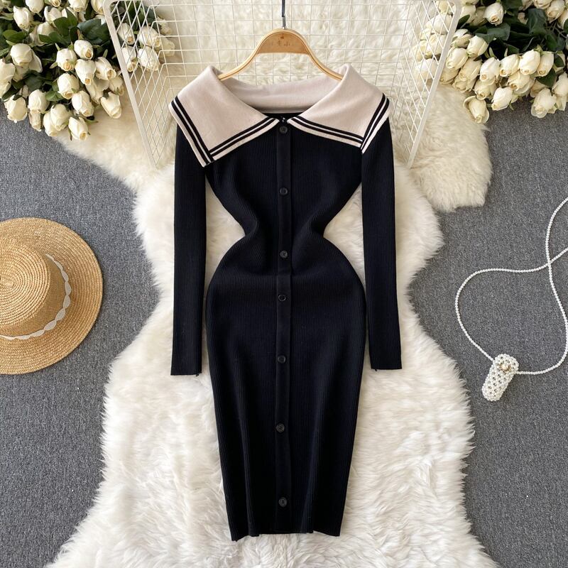 ボタン秋ニットミディドレス長袖弾性ウエストセクシーなニットドレス女性スリム暖かいセータードレス ロング エラスティック 伸縮 オータム 秋物 Abe37705768451